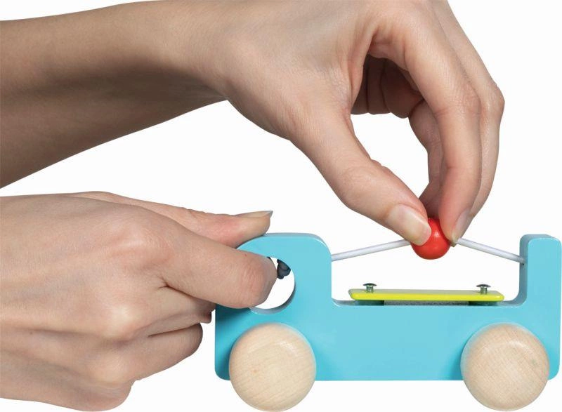 Zaskakującą cechą zestawu 4 autek z efektami dźwiękowymi Goki jest to, że znakomicie sprawdzają się one również jako wprowadzenie do świata rytmu i własnoręcznie tworzonej muzyki. Każdy drewniany samochodzik został zintegrowany z innym typem instrumentu muzycznego. Do dyspozycji dzieci są: