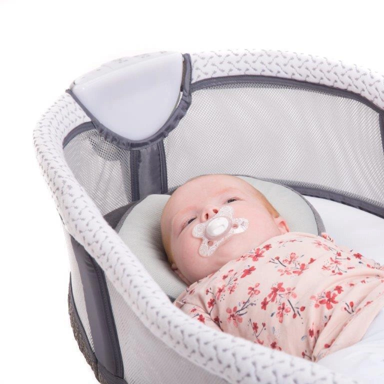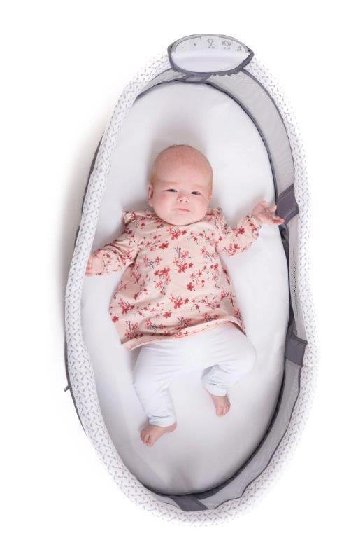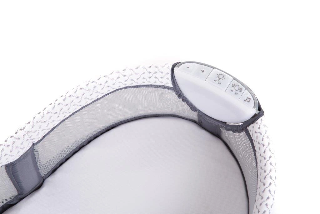 Dodatkowo łóżeczko posiada panel dźwiękowy, który umożliwia włączenie kojących wibracji, melodii oraz dźwięków natury z regulacją głośności, aby pomóc zasnąć dziecku.