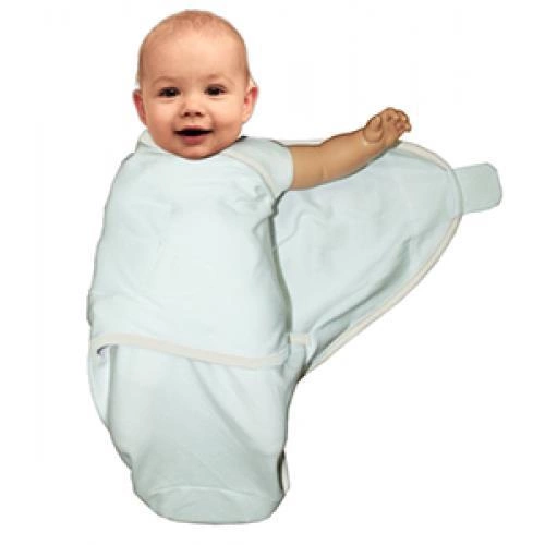 2.Otwórz zapięcie na rzep z boku. Przełóż lewą stronę koca na klatce piersiowej dziecka i dołączyć rzep na nogach. Umieść materiał pod prawym ramieniem dziecka.