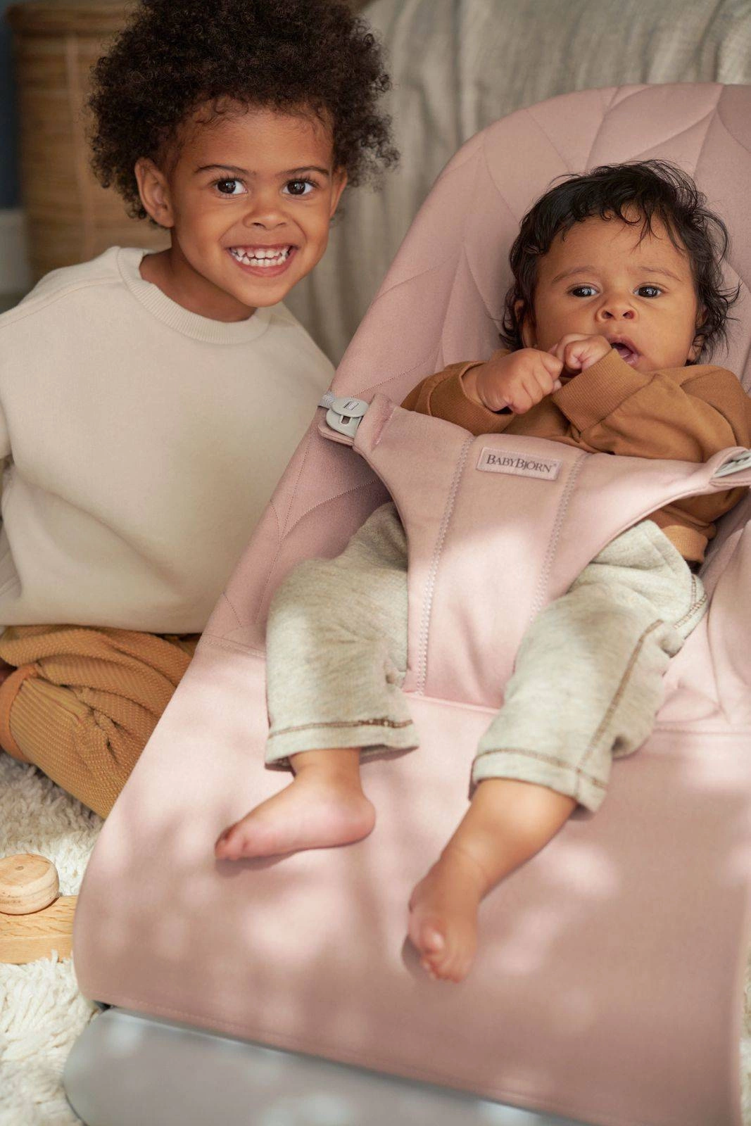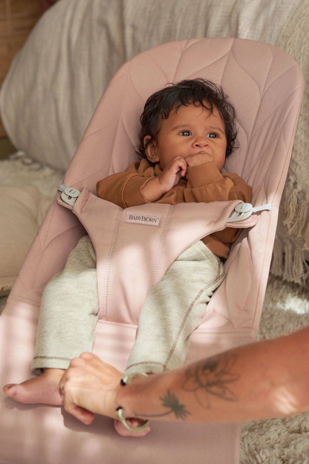 BABYBJORN - leżaczek BLISS COTTON, Petal Quilt, w kolorze Zgaszony róż z ramą w kolorze jasny szary + Zabawka Googly Eyes Pastels