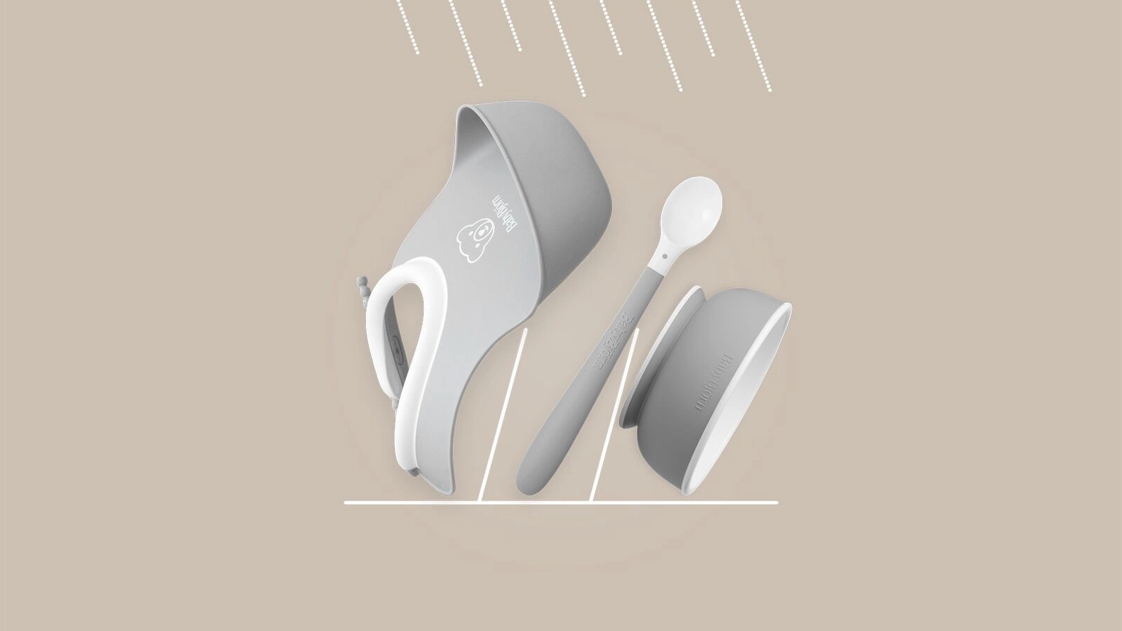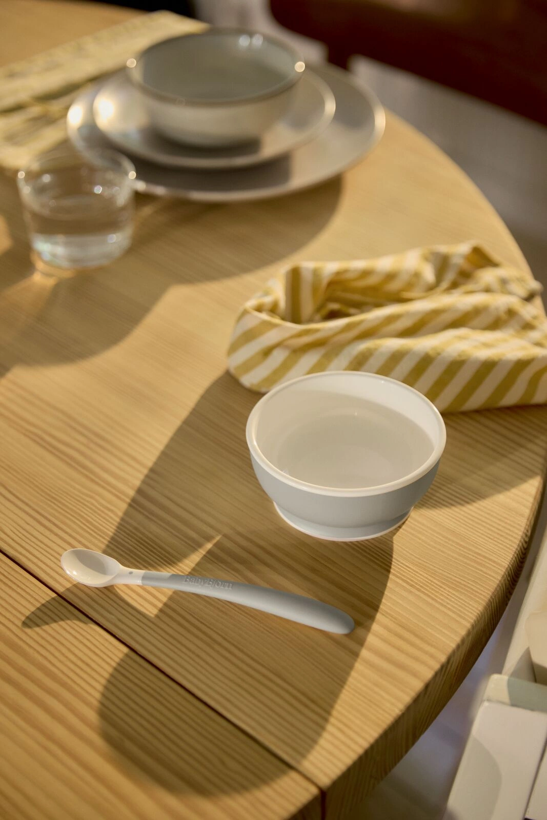 Solidna miseczka dla niemowląt, którą można łatwo trzymać podczas karmienia. Łyżka do karmienia z praktyczną długą rączką. Mały śliniaczek z wyjątkowo miękkim dekoltem.