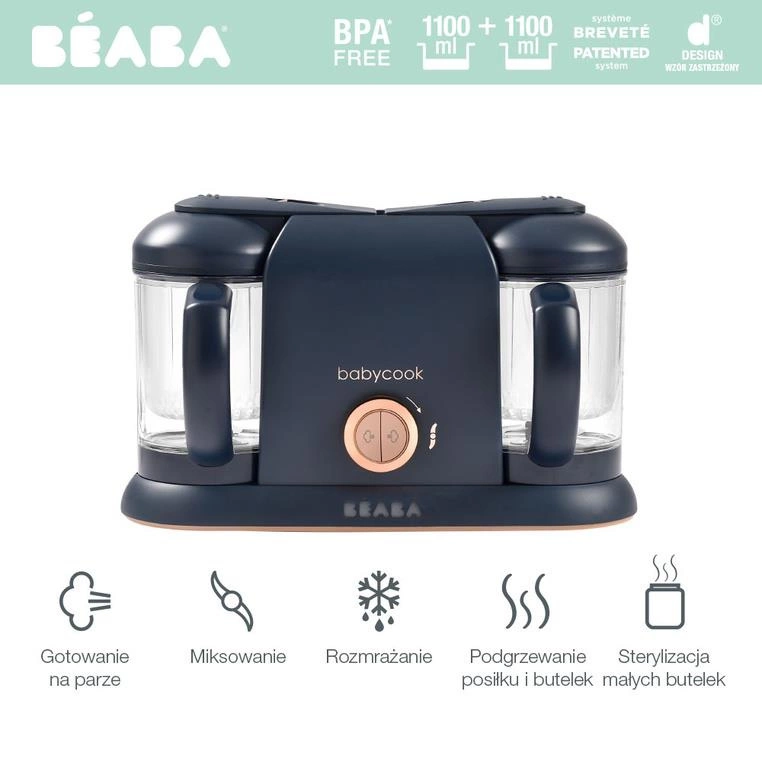 Wielofunkcyjne urządzenia do miksowania i gotowania na parze Babycook® francuskiej marki Beaba w wersji duo, czyli z dwoma dzbankami pozwoli przygotować pełny posiłek dla dziecka – od przystawek przez obiad do deseru – w niespełna 15 minut. Babycook® oferuje 6 funkcji w 1: gotuje na parze, miksuje, rozmraża, podgrzewa posiłki i butelki oraz sterylizuje małe butelki, a do tego jest cichy i łatwy w obsłudze.
