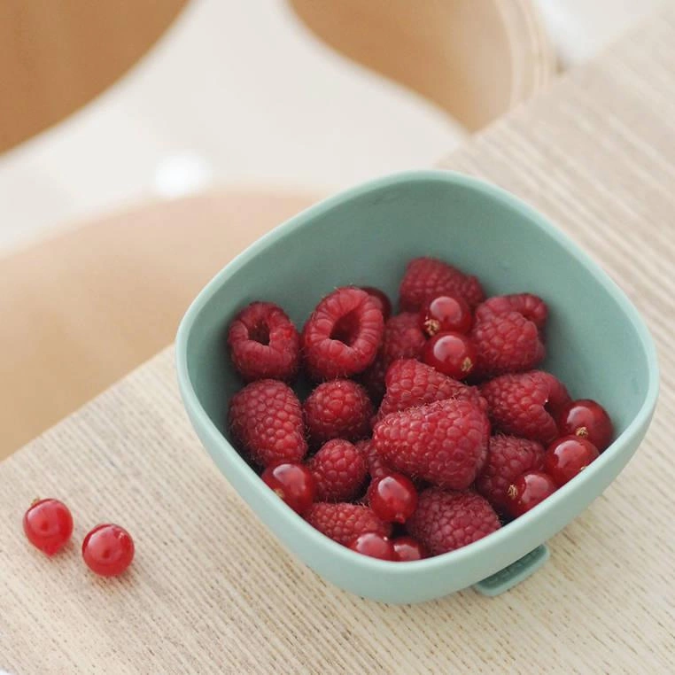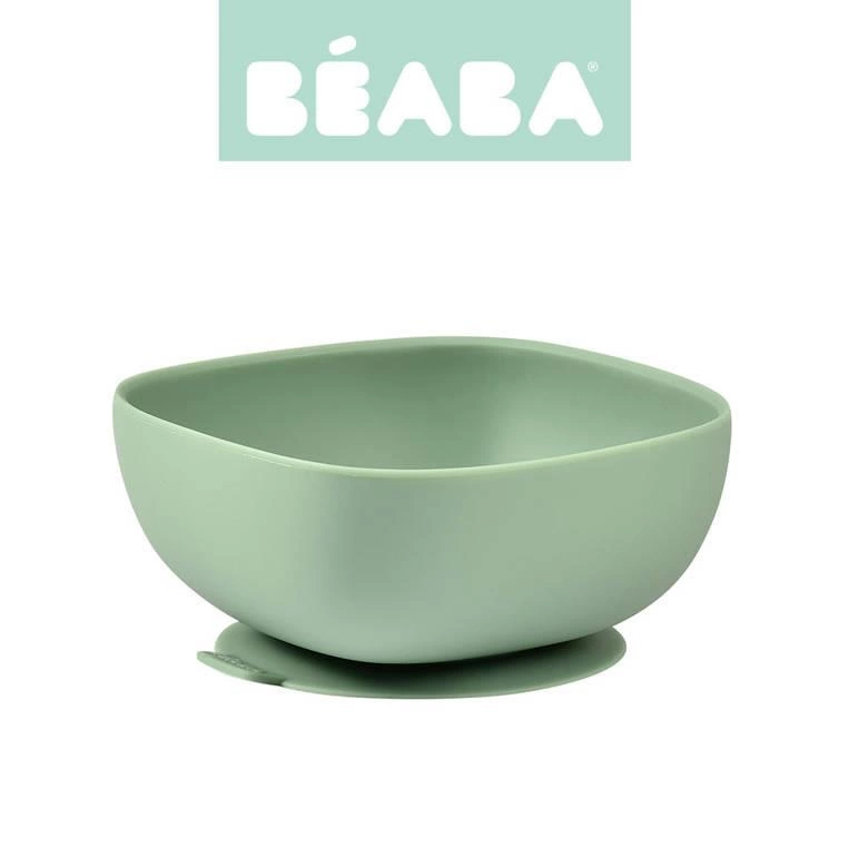 Silikonowa miseczka z przyssawką francuskiej marki BEABA posiada ergonomiczny, kwadratowy kształt z wysokimi, zaokrąglonymi po bokach brzegami, które ułatwiają dziecku samodzielne nabieranie posiłku na widelec lub łyżkę. Naczynie ma na spodzie antypoślizgową przyssawkę, dzięki czemu jest stabilne i dobrze trzyma się stołu. Miseczka ma kolor szałwiowej zieleni. Można ją myć ręcznie i w zmywarce, a także podgrzewać w mikrofalówce.