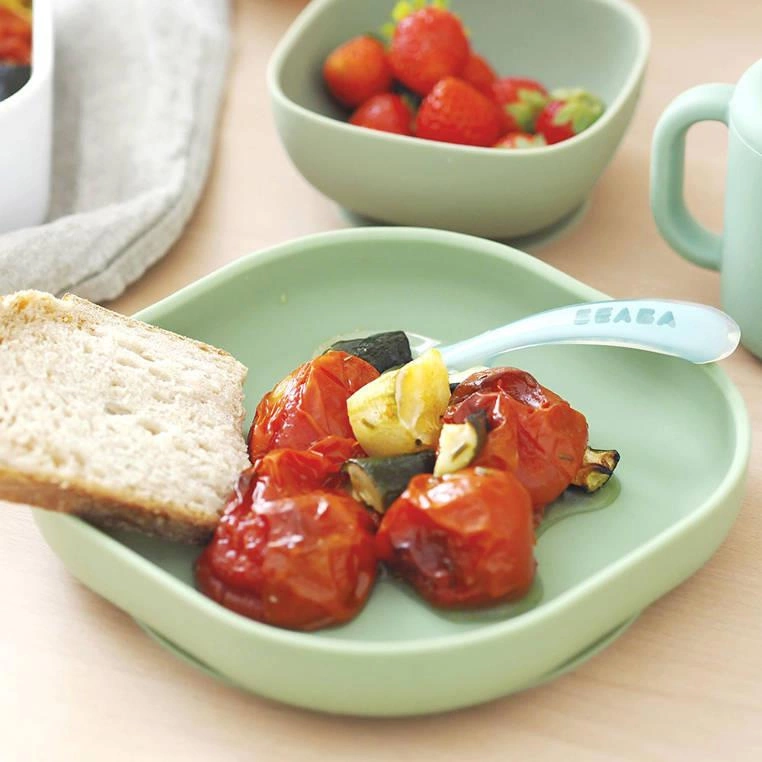 Silikonowy talerzyk z przyssawką francuskiej marki BEABA posiada ergonomiczny, kwadratowy kształt z wysokimi, zaokrąglonymi po bokach brzegami, które ułatwiają dziecku samodzielne nabieranie posiłku na widelec czy łyżkę. Naczynie ma na spodzie antypoślizgową przyssawkę, dzięki czemu jest stabilne i dobrze trzyma się stołu. Talerzyk ma kolor szałwiowej zieleni. Można go myć ręcznie i w zmywarce, a także podgrzewać w mikrofalówce.