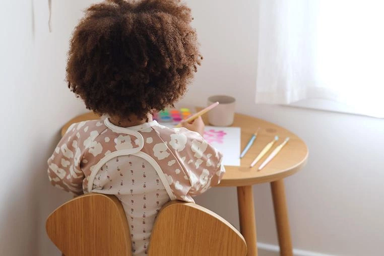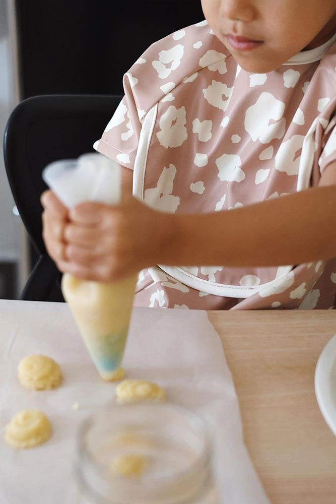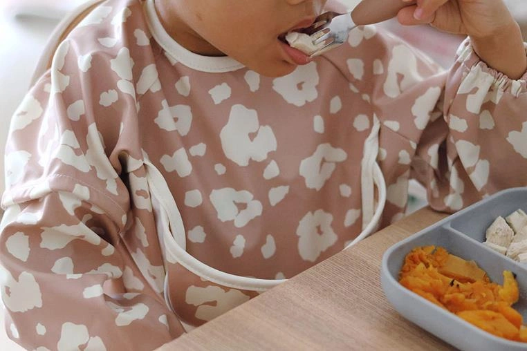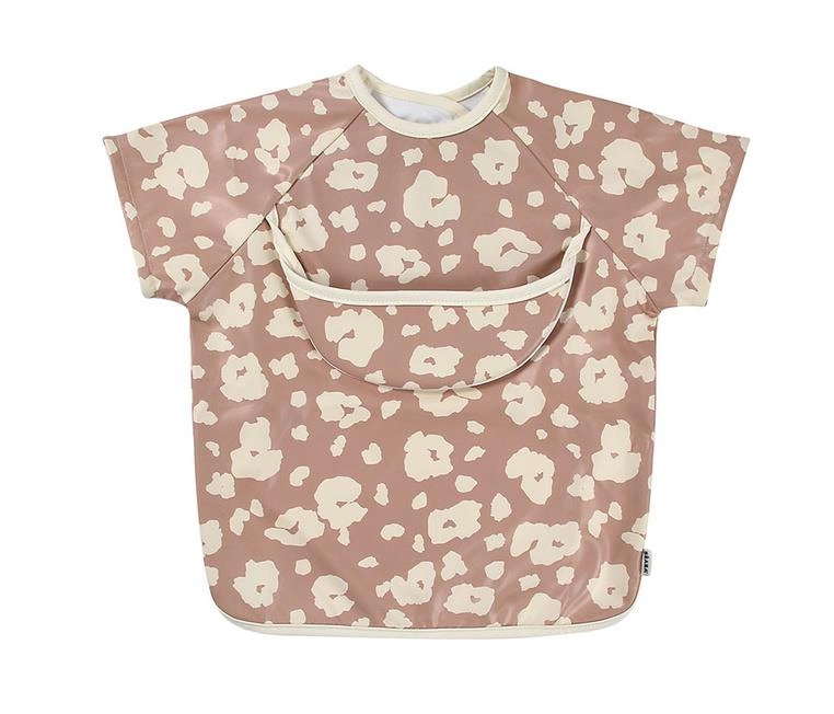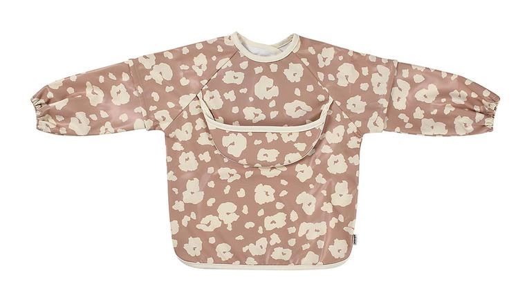 Dzięki trzystopniowemu zapięciu na zatrzaski śliniak rośnie razem z maluchem – pasuje już od 4. miesiąca życia aż do około 5 lat. Ma odpinane rękawy z elastycznymi mankietami, więc można go łatwo dostosować do pory roku czy rodzaju aktywności – w wersji z długim lub krótkim rękawem. Dodatkowo szeroki, składany kołnierzyk działa jak praktyczna kieszonka na resztki jedzenia, którą można schować np. na czas zabawy.