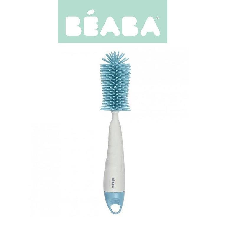 Silikonowa szczotka do butelek i smoczków francuskiej marki BEABA ma ergonomiczny kształt z zaokrągloną główką, co ułatwia dokładne czyszczenie butelek, pojemników, akcesoriów i ich zakamarków o dowolnym kształcie. Jej miękkie i giętkie silikonowe włosie zapewnia mycie bez zarysowań, a równie miękka, profilowana i dodatkowo teksturowana końcówka (chowana w dolnej części uchwytu) nadaje się idealne do precyzyjnego czyszczenia smoczków i innych drobnych akcesoriów. Wygodę użytkowania gwarantuje wydłużona rękojeść z otworem do zawieszania szczotki w kuchni. Szczotka jest łatwa do utrzymania w czystości, należy ją myć ręcznie. Kolorystyka charakterystyczna dla marki: biało-turkusowa.