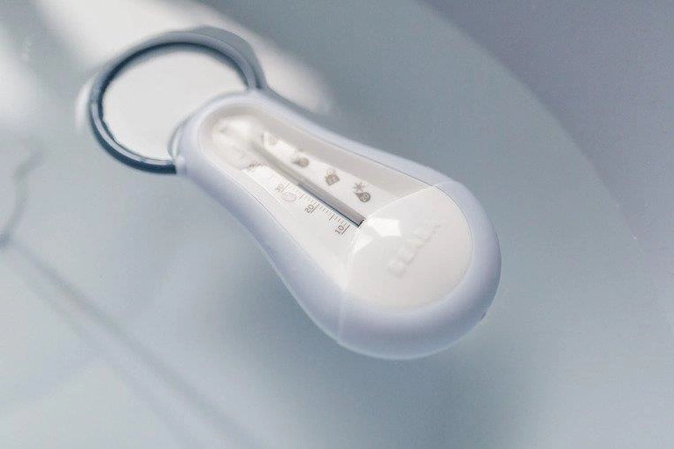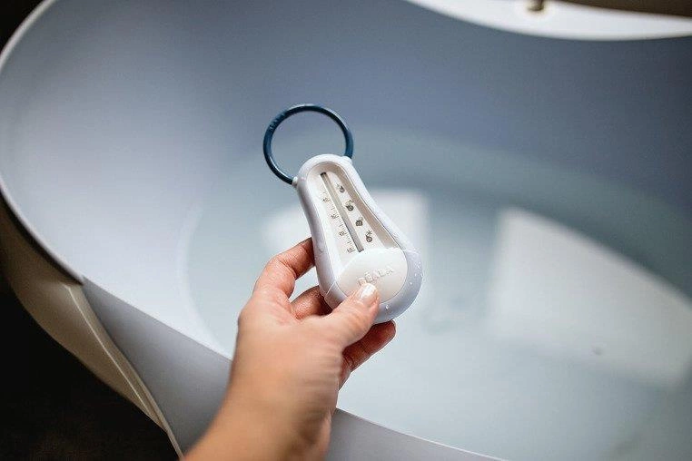 Termometr cieczowy francuskiej marki BEABA. Utrzymany w łagodnych odcieniach niebieskiego. Przeznaczony do mierzenia temperatury wody do kąpieli maluszków. Wygodny w użyciu. Może pływać w wanience i służyć malcowi również do zabawy. Jego zaokrąglony kształt sprawia, że jest całkowicie bezpieczny dla dziecka – nie ma ryzyka skaleczenia. Termometr posiada praktyczny uchwyt, ułatwiający trzymanie oraz zawieszenie go w łazience.