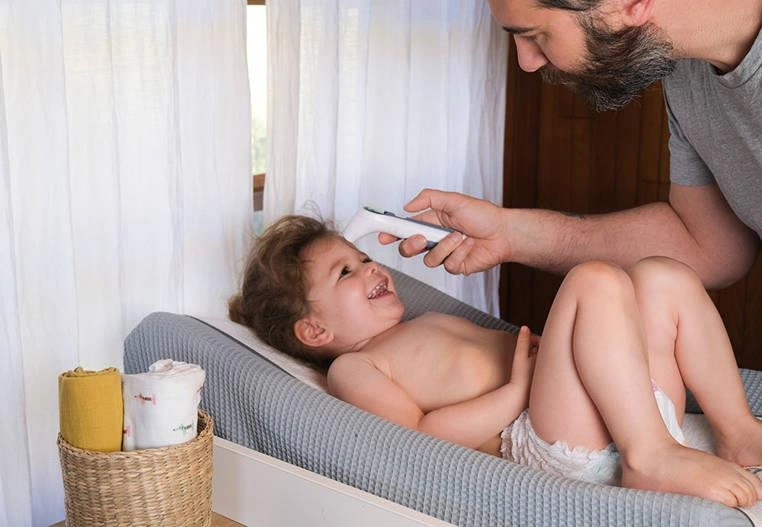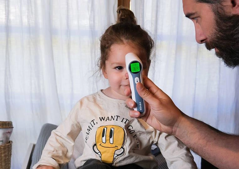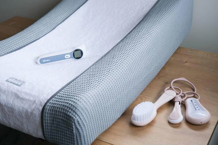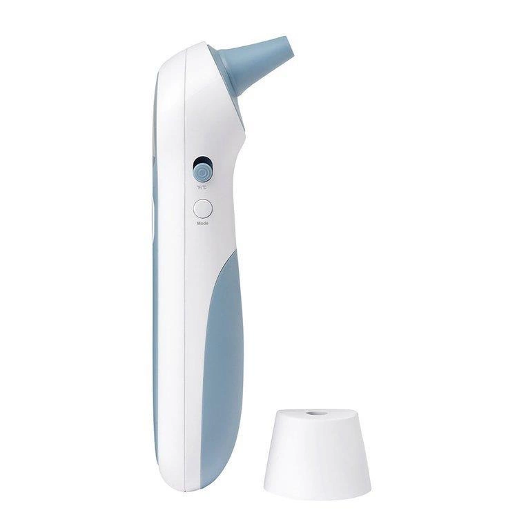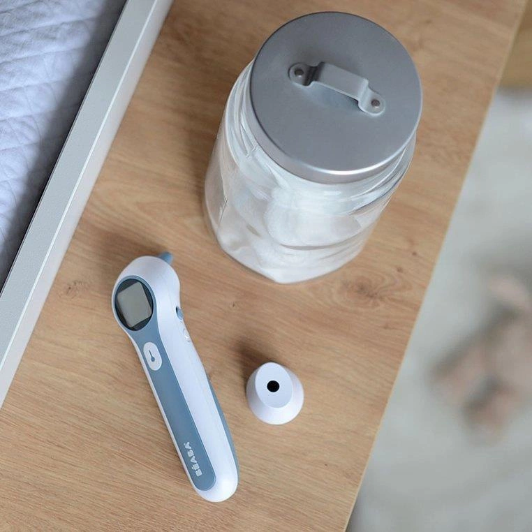 Wielofunkcyjny termometr bezdotykowy na podczerwień Thermospeed francuskiej marki BEABA to urządzenie medyczne (CE0482), przeznaczone do efektywnego i ultraszybkiego (w zaledwie 1 sekundę!) mierzenia temperatury. Niezwykle praktyczny i wygodny w użyciu. Służy zarówno do najbezpieczniejszego, bo bezkontaktowego, pomiaru temperatury ciała, zarówno w uchu, jak i na czole, jak również pomiaru temperatury pomieszczenia oraz dowolnych rzeczy, np. wody w wanience do kąpieli, mleka dla maluszka, gotowego posiłku itp. Ułatwia wiele codziennych czynności i pozwala troszczyć się o zdrowie i bezpieczeństwo nie tylko noworodków, niemowląt i dzieci, ale także całej rodziny. Ma ergonomiczny kształt, ułatwiający trzymanie i pomiar, antypoślizgowe wykończenie, intuicyjną, prostą obsługę i bardzo czytelny, spory monitor LCD. Po zdjęciu mocowanej na magnes pokrywy czujnika, urządzenie automatycznie przełącza się na tryb pomiaru temperatury w uchu. Termometr posiada wiele możliwości wyboru trybu pracy: ze względu na wiek (dziecko/dorosły), miejsce pomiaru (ucho/czoło), obiekt pomiaru (osoba/otoczenie), sygnał dźwiękowy (z sygnałem/cichy tryb nocny), oraz kilka różnych sygnałów komunikacyjnych, np. kod koloru, informujący o podwyższonej temperaturze i dodatkowy dźwięk, sygnalizujący gorączkę. Niezbędny w każdym domu!