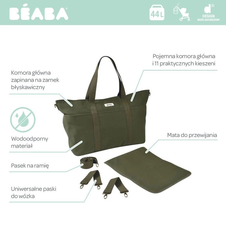 Funkcjonalna i ponadczasowa torba XXL dla mam francuskiej marki BEABA. Ma aż 11 kieszonek, dzięki czemu pomieści bez trudu niezbędne dziecięce akcesoria i wygodnie je posegregujesz. Torba i dołączone do niej akcesoria mają stonowaną ciemnozieloną barwę (trawy morskiej). Ma ona duży rozmiar, uniwersalny krój typu shopper i jest doskonałym kobiecym dodatkiem. Zapakujesz do niej również: telefon, długopis, notatnik czy klucze.