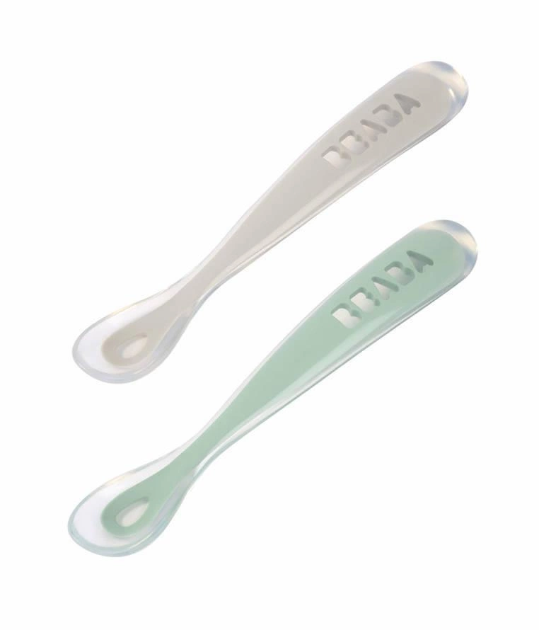 Zestaw dwóch ergonomicznych pierwszych łyżeczek dziecka francuskiej marki BEABA. Jedna w kolorze jasnozielonym, druga w kolorze szarym, obie z transparentnymi brzegami. Miękkie końcówki łyżeczek wykonane zostały z ultraelastycznego silikonu, w pełni bezpiecznego dla delikatnych dziąseł maluszka. Ich kształt został zaprojektowany tak, by ułatwiał malcowi przejście ze smoczka na łyżkę. Długość uchwytu sprawia, że łyżeczki nadają się również do jedzenia pokarmów ze słoiczka. Uchwyt ten jest ponadto zaprojektowany do trzymania przez dorosłe ręce, podczas karmienia dziecka. Łyżki łatwo się czyści, można je myć ręcznie lub w zmywarce.