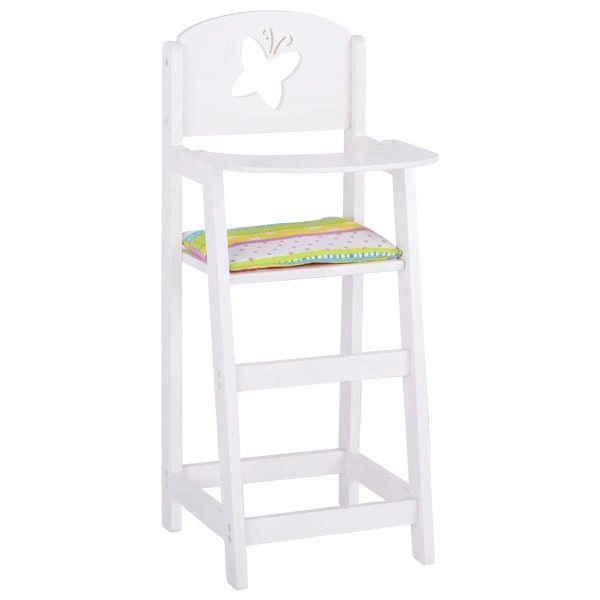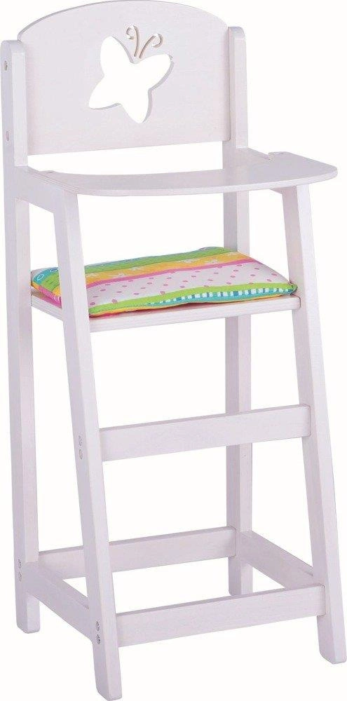 Białe krzesełko do karmienia lalki, Krzesełko marki Goki to niezbędny element do każdego kompletu mebelków dla lalki. Niejedna dziewczynka pragnie wypić herbatkę wraz ze swoją lalką przy jednym stole. Wykonane z drewna krzesełko na oparciu posiada wyciętego motylka, a na siedzeniu kolorową poduszkę z charakterystycznymi dla serii Susibelle kwiatkami, motylkami oraz pastelowymi paseczkami. Teraz wspólny posiłek, czy herbata z ulubioną laleczką staną się czystą przyjemnością.