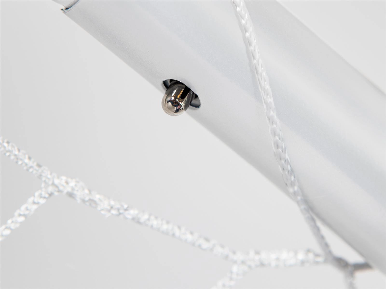 Wystarczy 15 min. aby bramka była gotowa do użycia. Elementy łączone są na zatrzask, co sprawia, że szybko i w łatwy sposób złożysz i rozłożysz bramkę. W zestawie znajdują się również metalowe "śledzie" mocujące bramkę do podłoża.