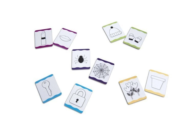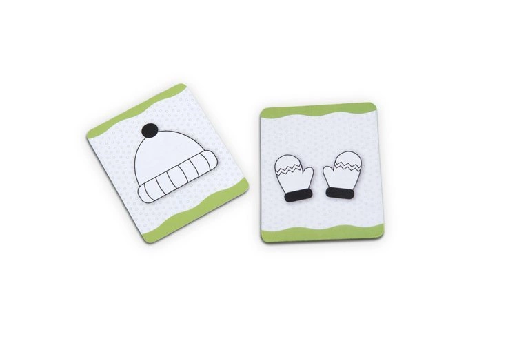 Rozgrywka: Odwróć kartę ze stołu i zobacz, czy pasuje do jednej z trzymanych kart. Karty nie mają takich samych rysunków, ale pasują tematycznie np czapka i rękawiczki. Jeśli nie pasują, odwróć z powrotem. Jeśli pasują, odłóż swoją parę na bok i weź nową cienką kartę ze stosu. Ponieważ stworzyłeś parę,  możesz grać ponownie.