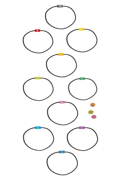Hop Scotch - to nowa odsłona popularnej 'gry w klasy'. Zestaw zawiera 10 sznurkowych obręczy o średnicy 30 cm oraz 3 krążki do rzucania. Do zestawu dołączono poręczny bawełniany worek do przechowywania.