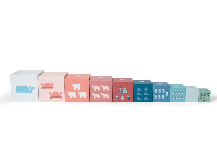 Kolorowa wieża z klocków z dziesięcioma sześcianami w różnych rozmiarach ( 10 x 5 cm - 6 x 6 cm). Dziecko ma za zadanie ustawić piramidę z 10 kostek kolejno zaczynając od największej tak, aby tworzyła ona logiczny ciąg składający się z obrazków zwierząt i liczb. Oprócz tego dziecko ma możliwość takiego ustawienia kostek poziomo, jedna obok drugiej aby obrazki wskazywały liczby i ilości zwierząt od 1 do 10.