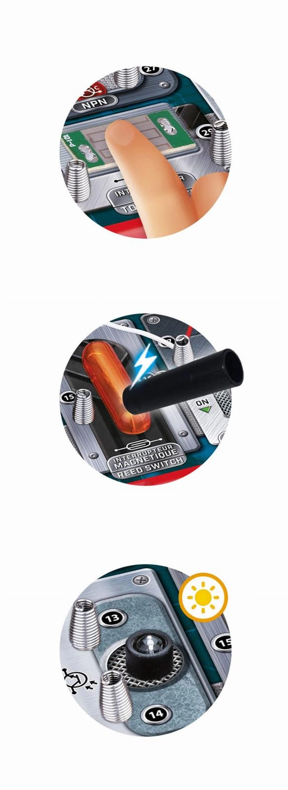 Złóż elemeny na tablicy elektronicznej i stwórz ponad 50 obwodów elektrycznych: alarm, efekty dźwiękowe, cyfrowy ekran...