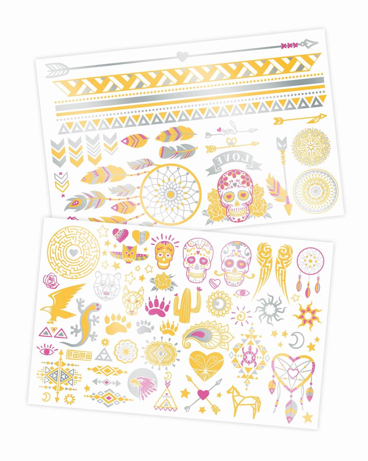 2 arkusze z około 75 zmywalnymi tatuażami z metalicznym połyskiem - łapacze snów, piórka, bransoletki.