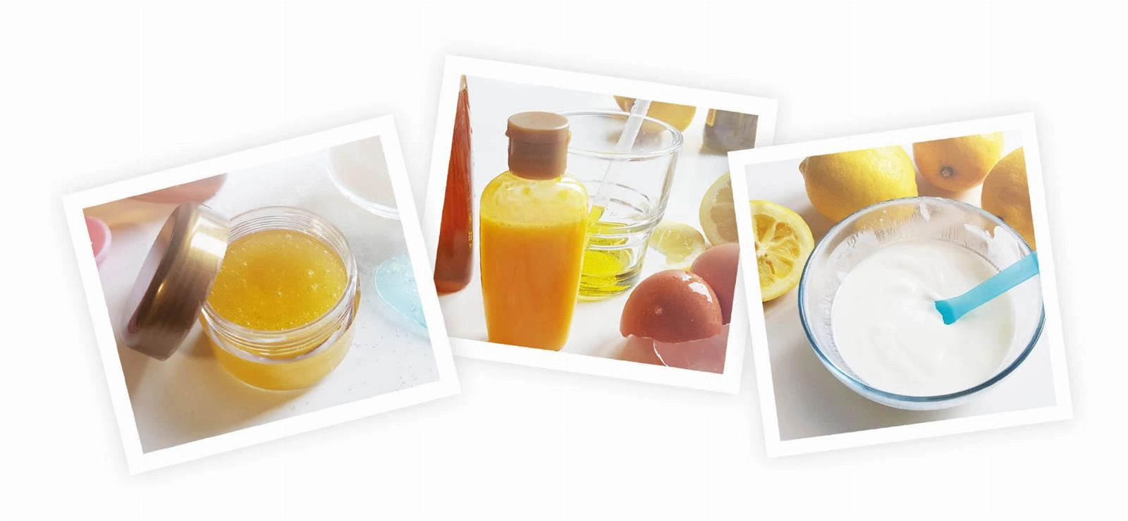 Produkty potrzebne do wykonania kosmetyków: olej z oliwek, płynny miód, cukier kryształ, mąka, mąka kukurydziana, mleko, mleko kokosowe, sok pomarańczowy, żółtko jaja, ocet jabłkowy, mielone migdały, sok z cytryny, dojrzałe awokado, banan, jogurt naturalny, mydło, masło shea (dostępne w popularnych drogeriach).