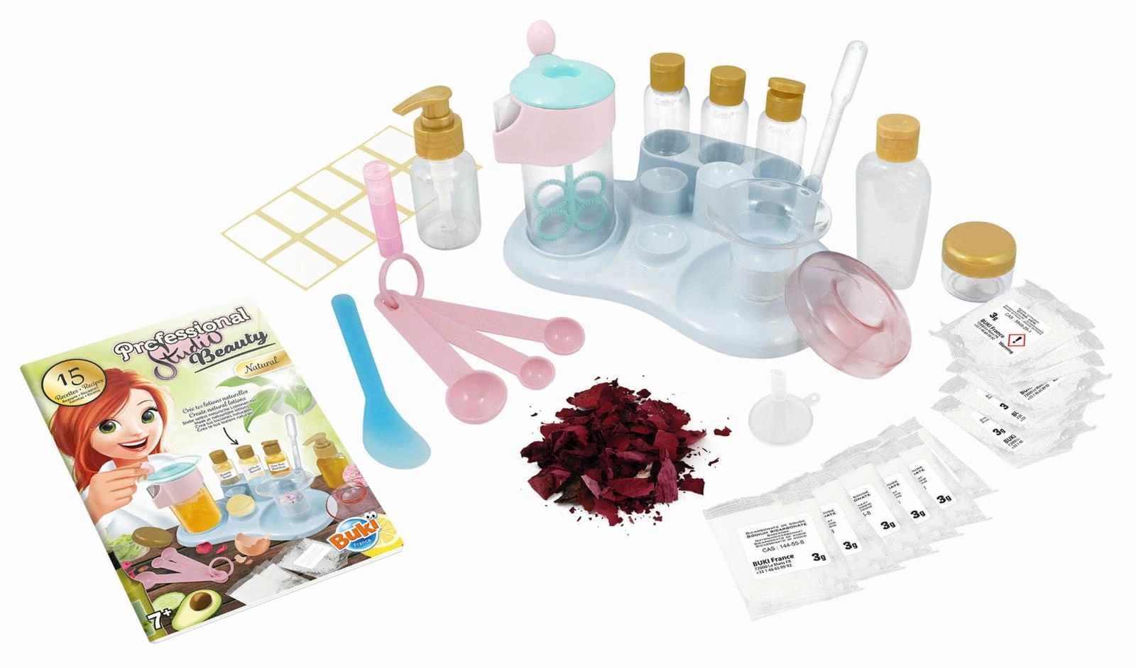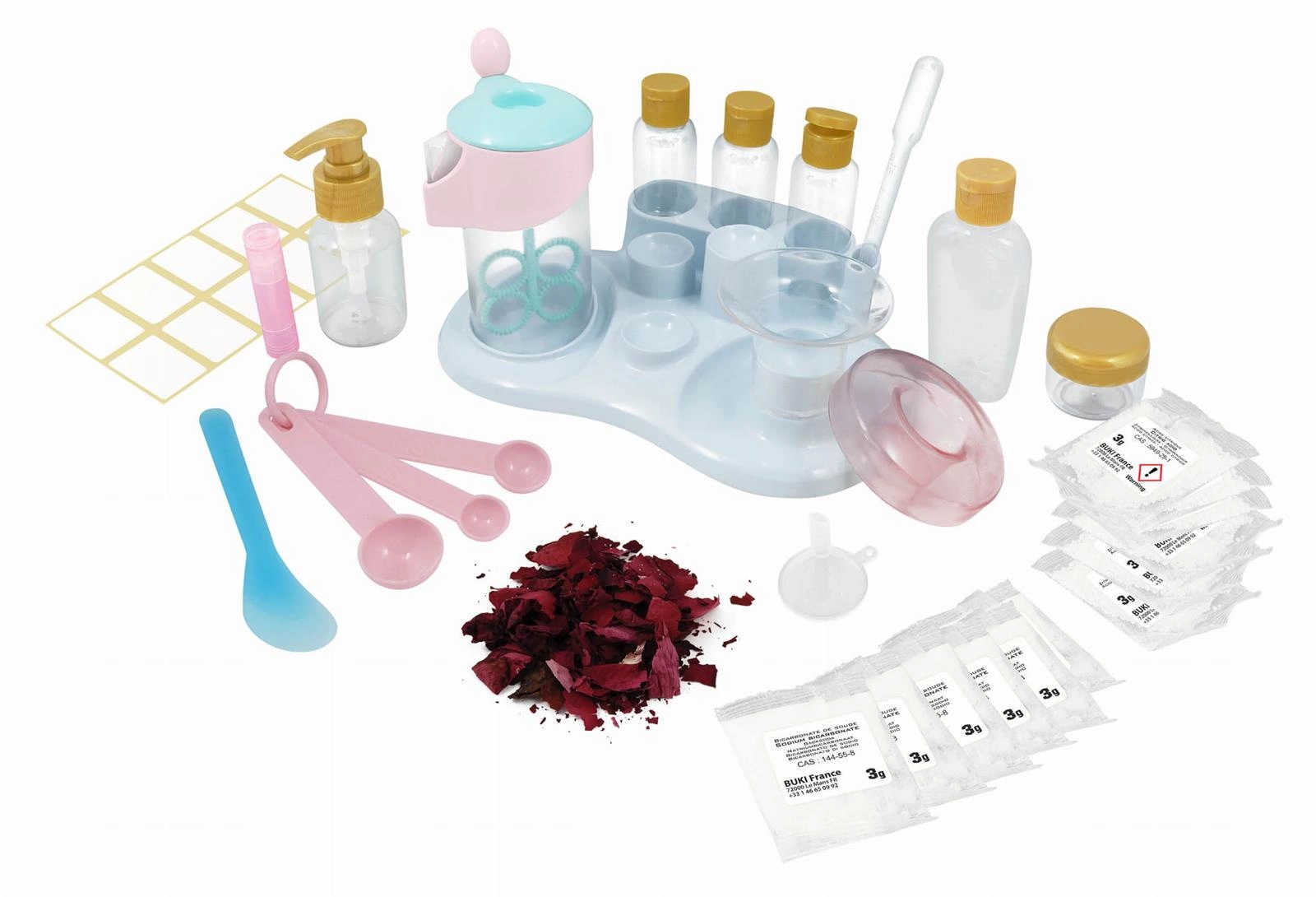 Stwórz produkty kosmetyczne, używając składników, które na co dzień znajdują się w domu. Użyj miksera do przygotowania szamponu, balsamów, maseczek i kremów, a następnie rozlej je do butelek. Z dołączonych saszetek zrobisz kule do kąpieli, które możesz spersonalizować za pomocą suszonych kwiatów!