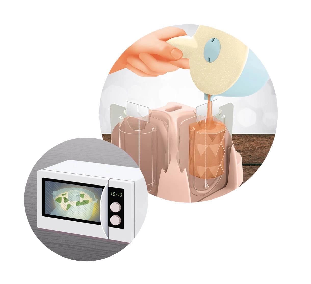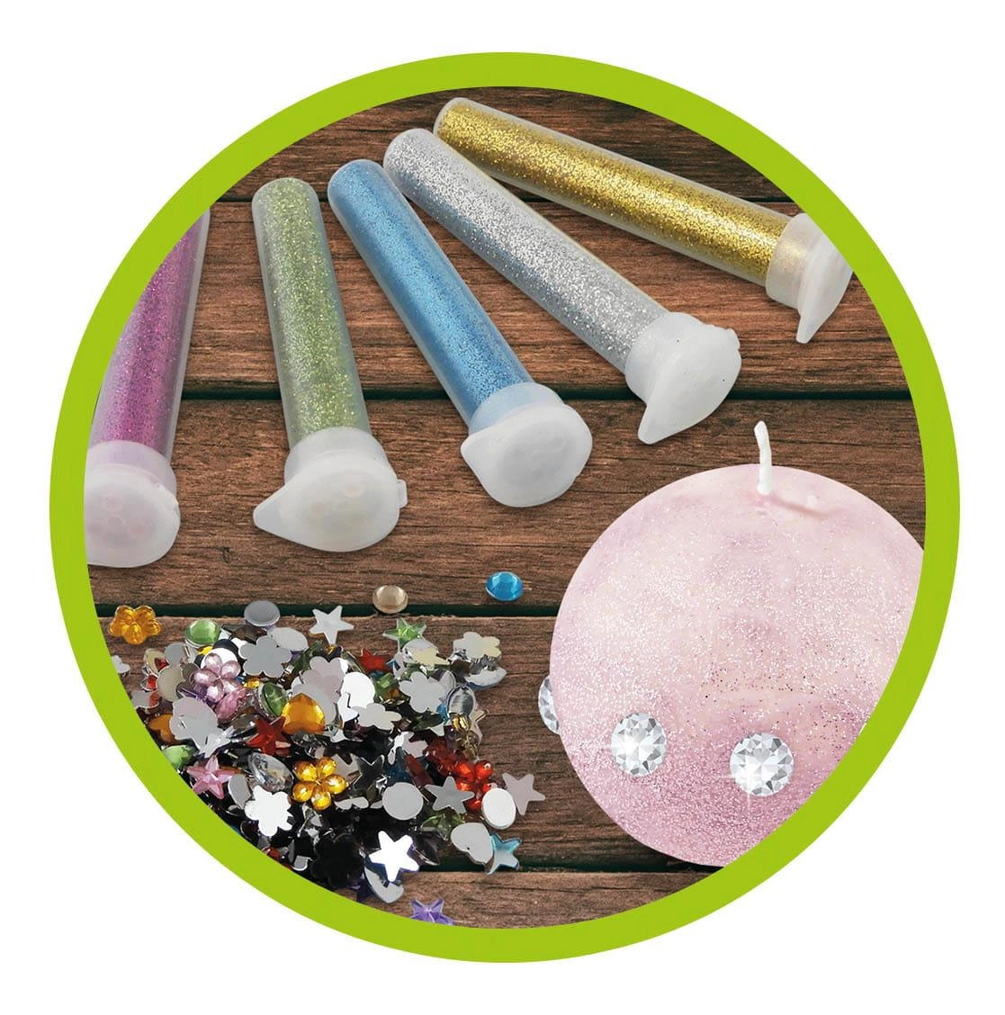 Specjalny pojemnik z pokrywą pozwoli Ci bezpiecznie stopić wosk w kuchence mikrofalowej. Dodaj kawałki woskowych kredek aby zrobić kolorową świecę. Następnie użyj cyrkonii, brokatu lub innych ozdób. Zawiń zawieszkę i ukryj ją w świecy jako wyjątkowy prezent!