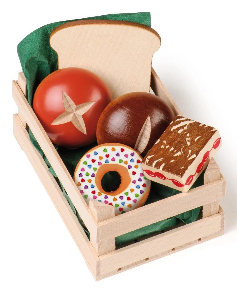 Drewniane pieczywo marki Erzi przyda się podczas zabawy w sklep. Pyszne rogaliki, bułeczki oraz słodkości w postaci ciasta. To wszystko możesz sprzedawać w swoim kramiku. Zestaw zawiera 5 drewnianych elementów: pączek, kromka chleba tostowego, ciastko, 1 kajzerka oraz 1 mała bułeczka. A może "zje" je z apetytem lalka z twojego pokoju, miś, pluszak, czy inna maskotka :) ?