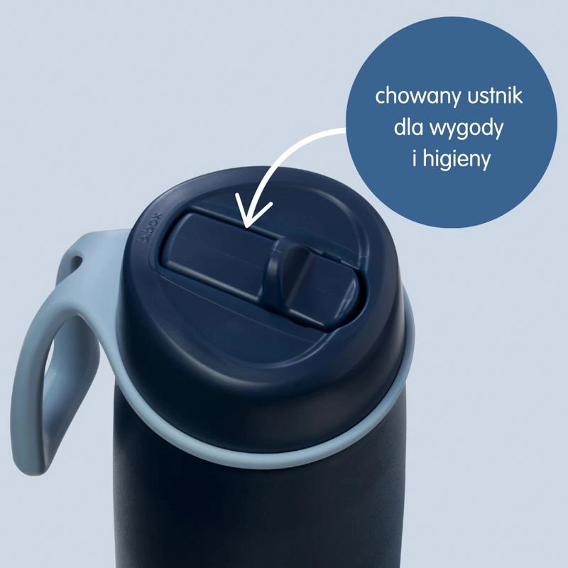 - Praktyczny ustnik i słomka: chowany ustnik to wygoda i higiena, a odchylany dzióbek ułatwia szybkie picie.