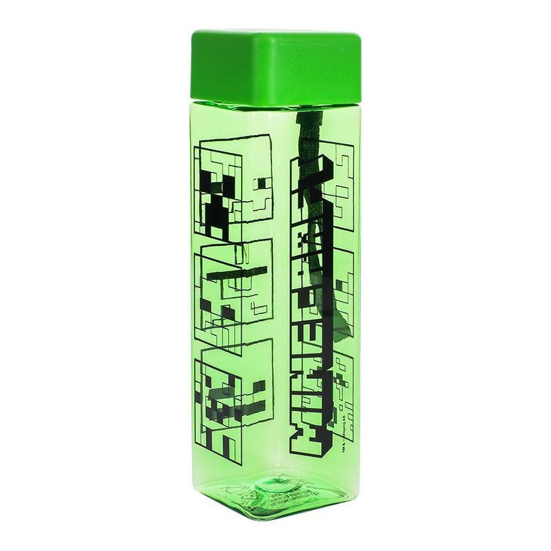Zielona, kwadratowa plastikowa butelka o pojemności 500 ml jest ozdobiona ikonami i logo Minecraft.