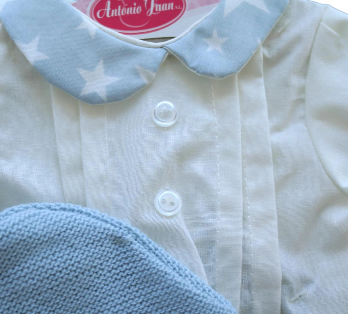 Niebieski komplet w gwiazdki to kolejny zestaw oferowany przez markę Antonio Juan, przeznaczony dla lalki o wysokości 42 cm. Komplet posiada krótki rękaw. Strój składa się z eleganckiej białej koszuli zapinanej z tyłu na rzepę oraz eleganckich bufiastych spodenek, które są gumce. Koszulę ozdabiają przyszyte guziczki oraz materiałowe zakładki umieszczone na środku ubranka. Dekorację ubranka stanowi niebieski kołnierzyk oraz mankiety z motywem w białe gwiazdki. Dodatkowo komplet wyposażono w niebieską czapkę wykonaną z dzianiny, do której przyszyte zostały dwa białe polarowe pomponiki. Dzięki posiadaniu w swojej garderobie takich dodatków kolekcja zostanie urozmaicona, a tworzone stylizacje będą coraz ciekawsze.