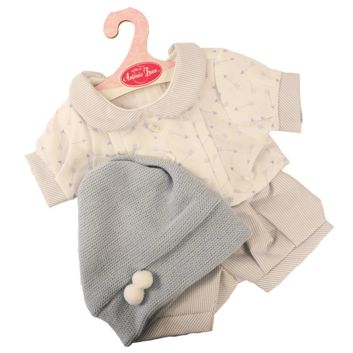 Koszula ze spodenkami to zestaw odpowiedni dla lalki o wysokości 42 cm. Komplet ozdobiony wzorem w drobne paski i jest uszyty na krótki rękaw. Koszulka z kołnierzykiem zapina się z tyłu na rzepę, natomiast spodenki są nakładane na gumce. Komplet uzupełnia wsuwana czapka z pomponami wykonana z błękitnej dzianiny