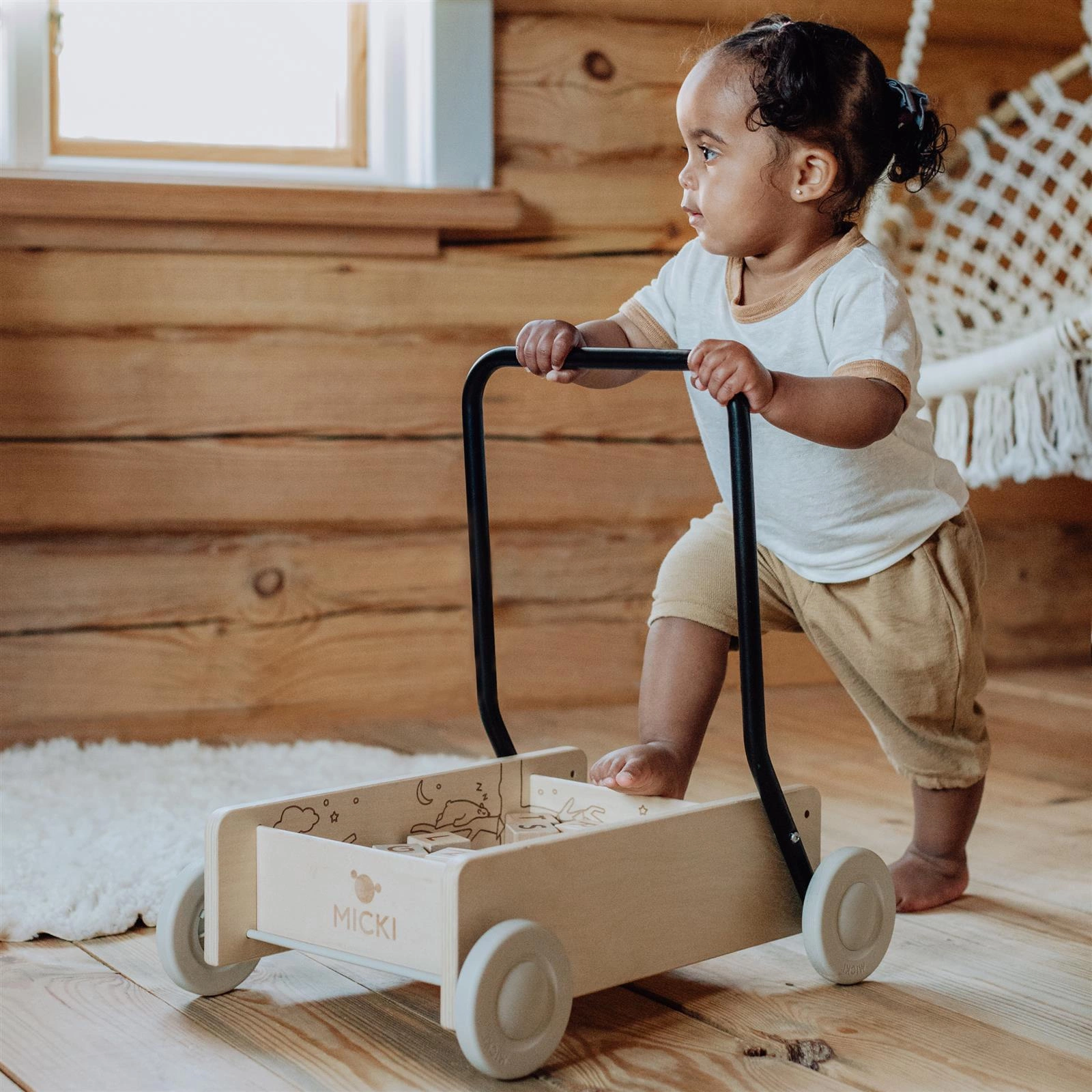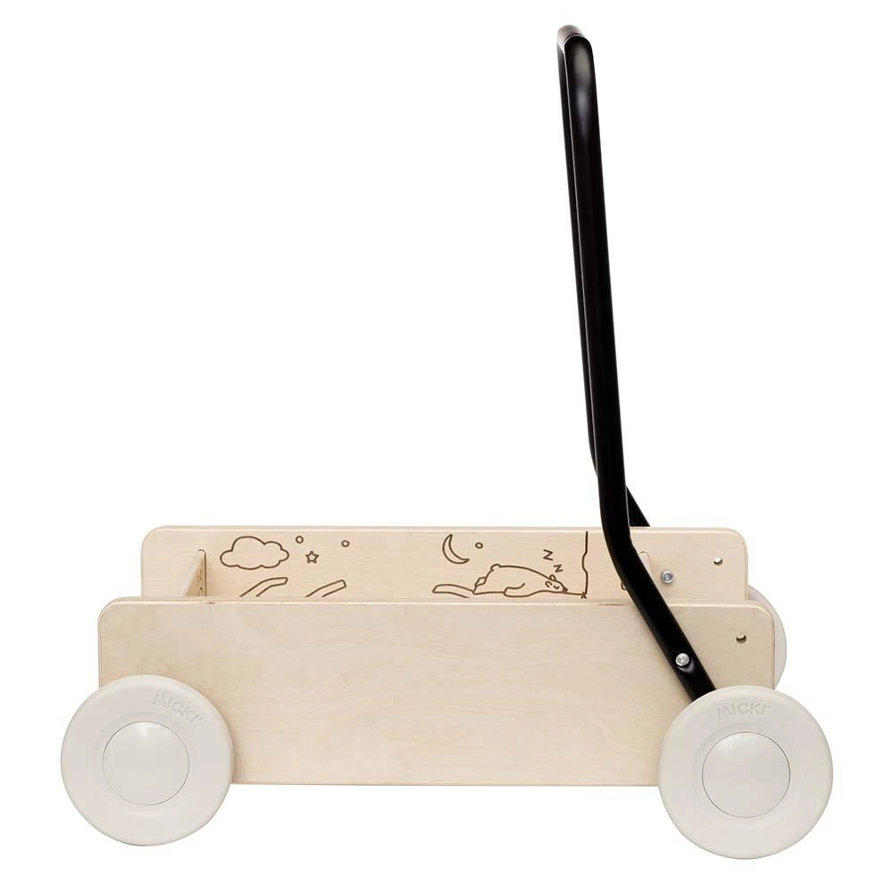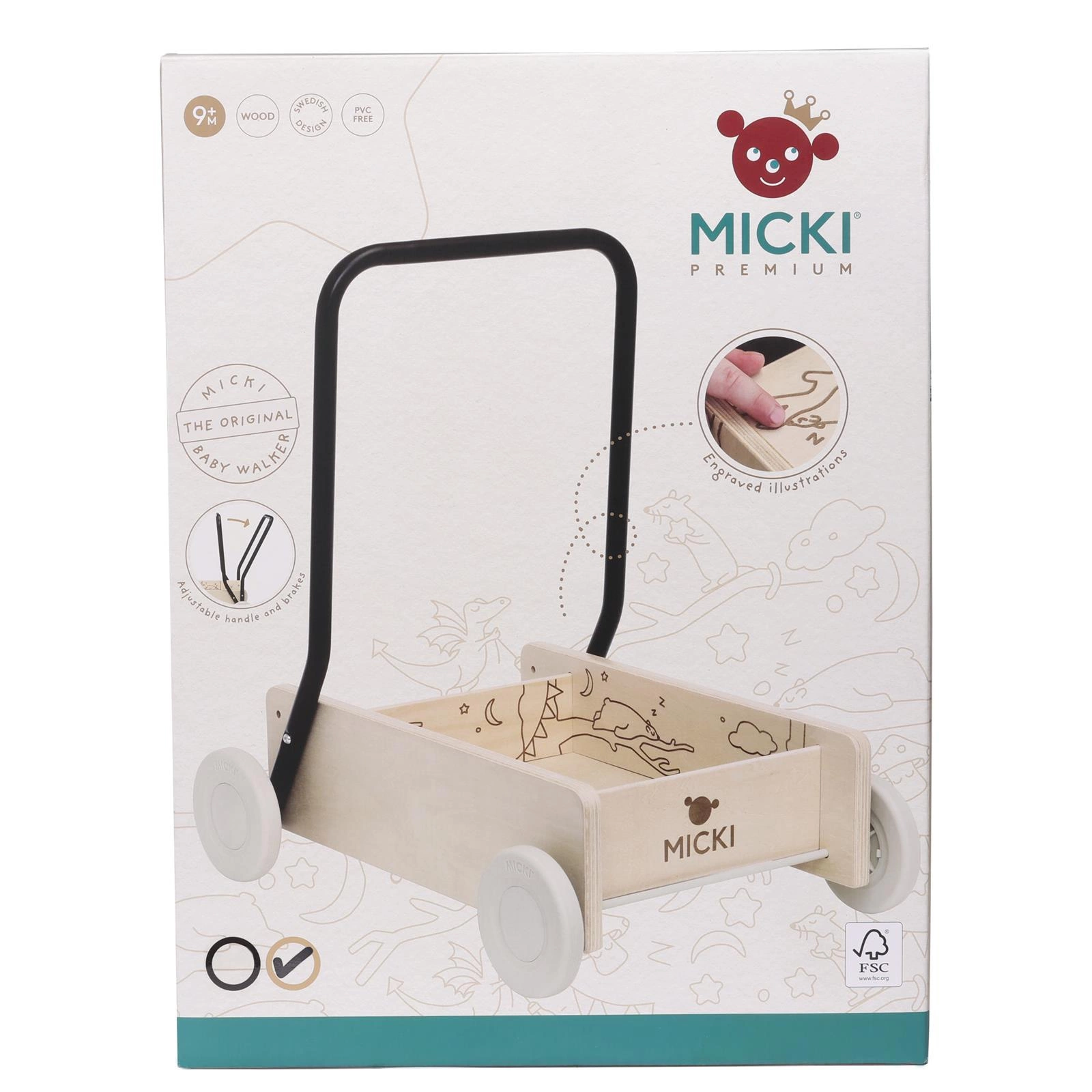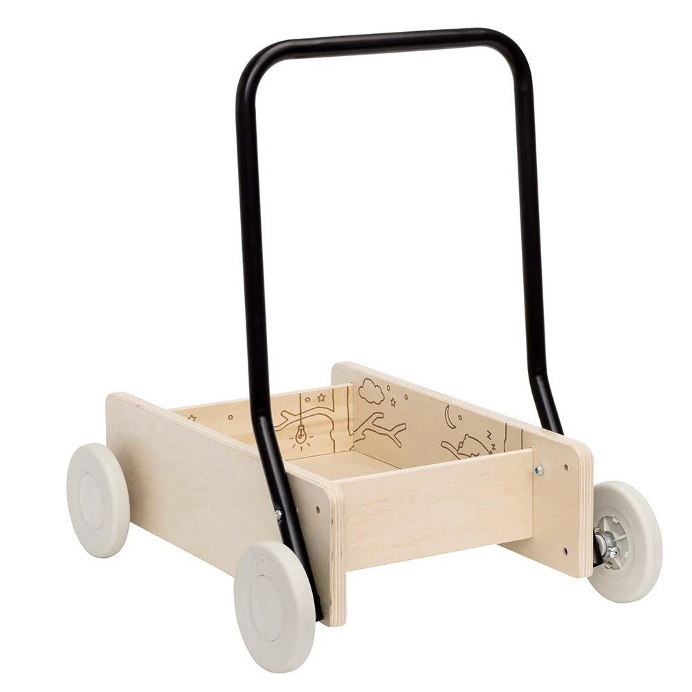 Klasyczny chodzik dla dzieci Micki! Drewniany chodzik z linii Premium posiada wygrawerowane detale. Pchacz zapewnia stabilne i pewne wsparcie dla pierwszych kroków dziecka, ma koła z hamulcami oraz regulowaną rączkę. Gdy dziecko nauczy się chodzić, rączkę można dostosować, aby zrobić z pchacza wózek dla lalek, który można używać przez wiele lat. Może klocki potrzebują być przetransportowane gdzieś, albo miś chce pójść na spacer?