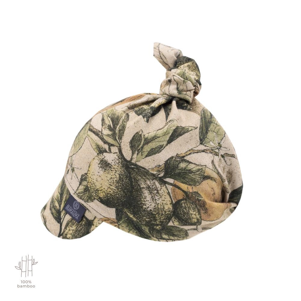 Miękka, bambusowa chustka, która świetnie chroni główkę przed wiatrem i promieniami słońca. Z przodu ma kształtny daszek, który dodatkowo chroni buźkę przed promieniami słonecznymi. Z tyłu w chusteczkę jest wszyta gumeczka dzięki, której dopasowuje się ona idealnie do rozmiaru główki maleństwa, a leżącego maluszka nie ugniata w kark jak supełek.