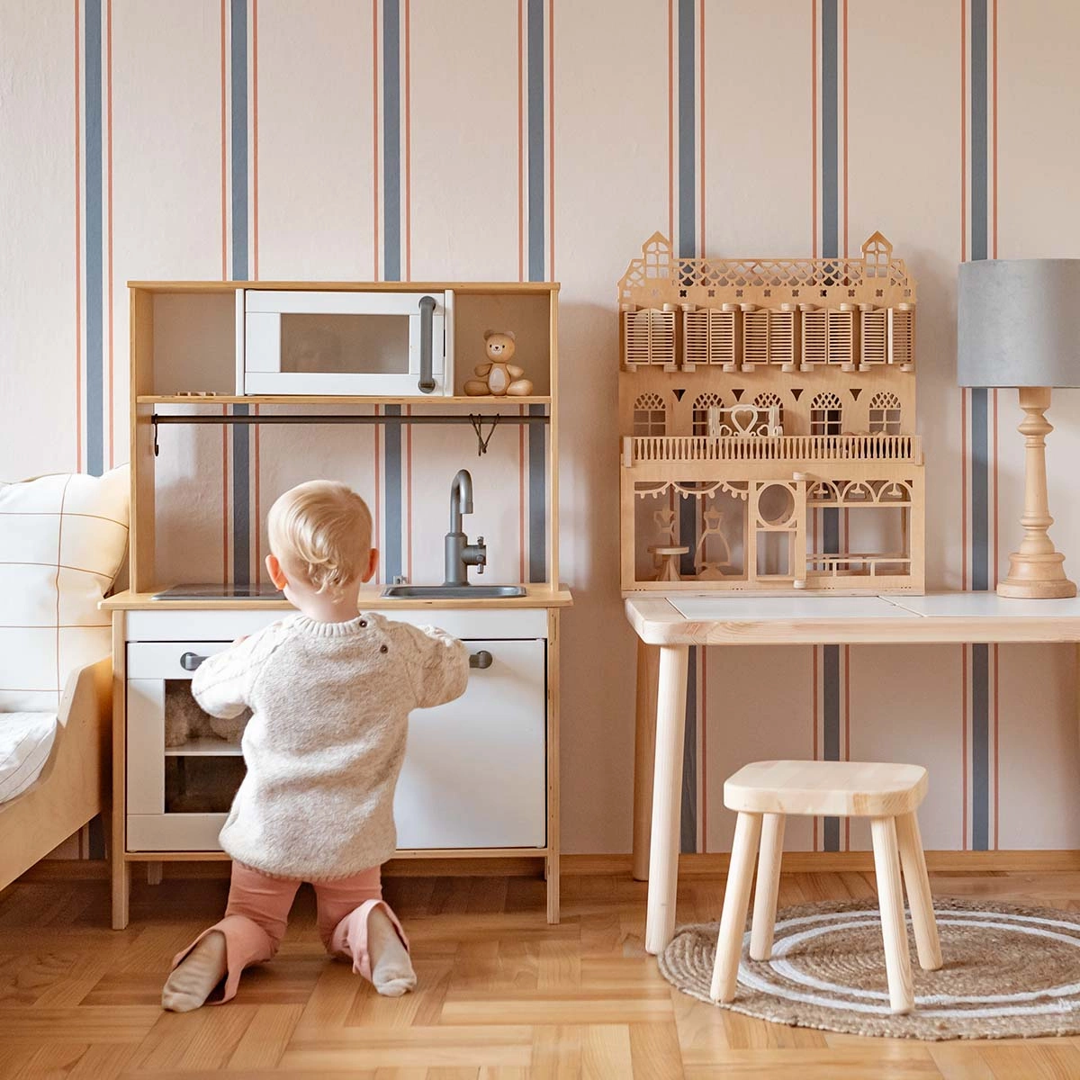 CLASSIC Stripes Tapeta klasyczna w pasy – Bardziej klasycznych kolorów nie można sobie wyobrazić. Lniany beżowy, delikatny niebieski i ładna czerwień, nie przebijająca się zbyt mocno. To tapeta jak z Hamptons lub angielskich willi. Lekki pattern, wzór na wiele lat. Świeta w zestawieniu z białymi meblami. Klasyk! TECHNICZNIE: Tapeta jest podzielona na pasy (bryty):