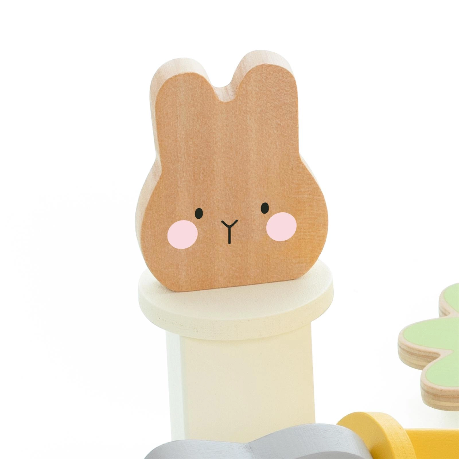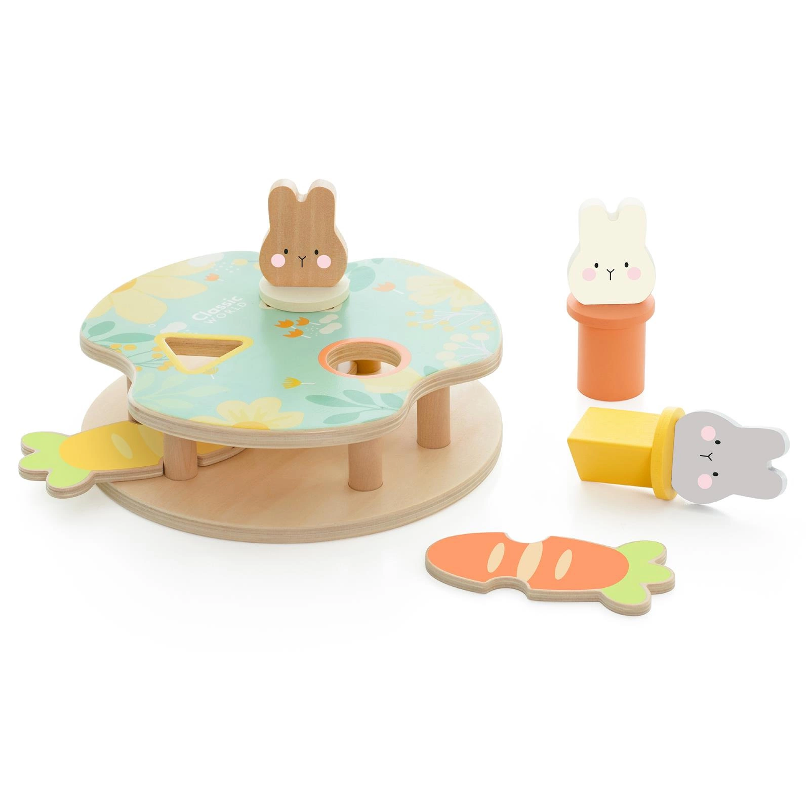 Wyskakujące Króliczki od marki CLASSIC WORLD to nowoczesna pastelowa zabawka typu pop-up, która oprócz cieszenia oka swoim wyglądem rozwinie zdolności motoryczne twojego dziecka.Wspaniała gra w dopasowywanie kształtów, poprawi świadomość koloru i kształtu twojego dziecka. Polega na umieszczeniu trzech uroczych króliczków w odpowiednich wejściach na górze i dopasowaniu ich pod względem koloru i kształtu. Naciśnięcie kawałków marchewki powoduje, że króliczki wyskakują z kwiatów! Zabawka wykonana jest z dobrej jakości drewna, nie posiada ostrych krawędzi co czyni ją zabawką BEZPIECZNĄ. Gra pomaga w zrozumieniu zależności przyczynowo-skutkowych, co wspiera prawidłowy rozwój dziecka.