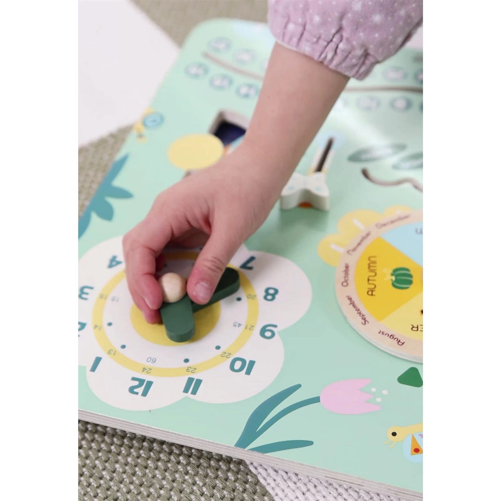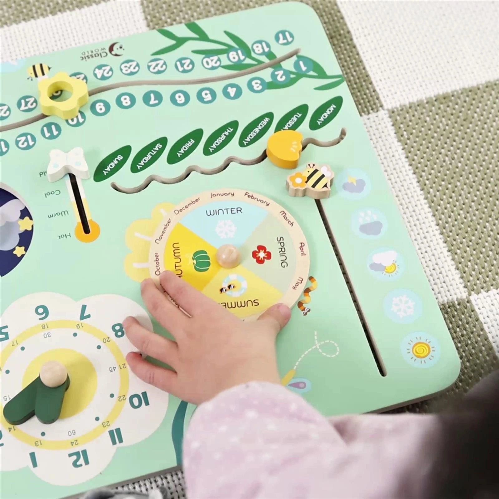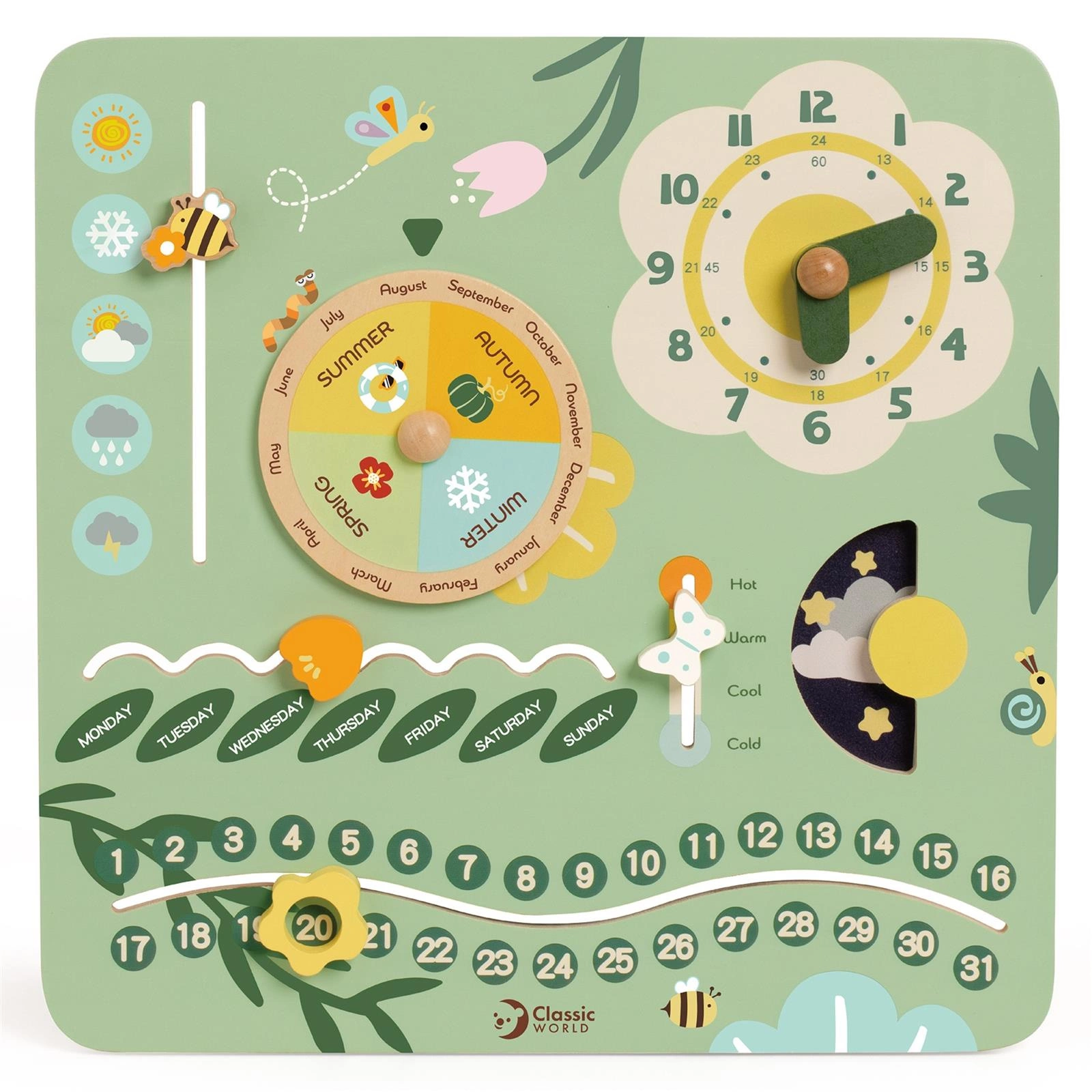 Drewniana tablica rozwija zdolności manualne, koncentrację i cierpliwość - dziecko uczy się odczytywania godzin, dni tygodnia, dat i pór roku. Może także poznawać zmieniającą się pogodę i temperaturę.