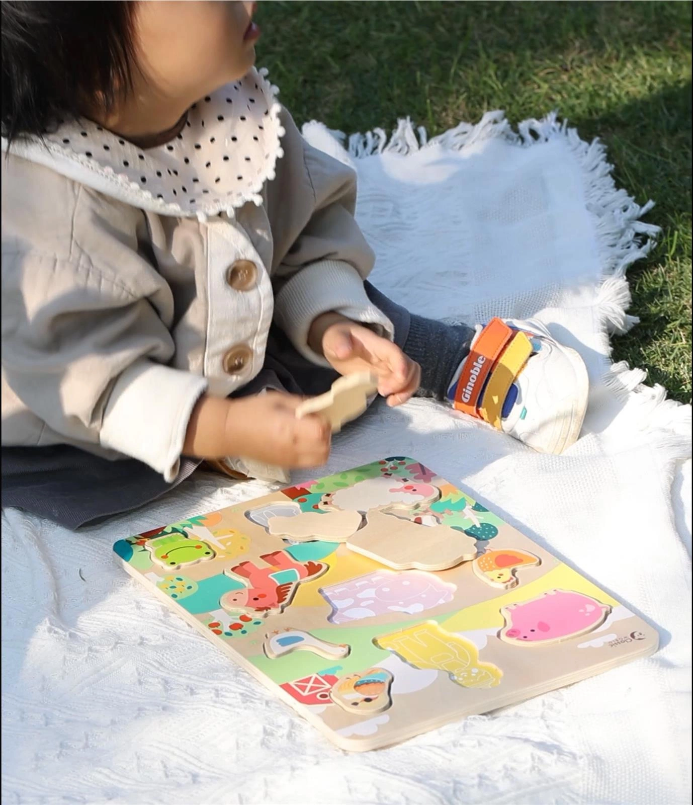 Kolorowa układanka z motywem farmy, zawiera drewniane figurki zwierząt do dopasowania na planszy. Wykonana z bezpiecznego drewna, rozwija zdolności manualne, koordynację ręka-oko, wyobraźnię oraz uczy rozpoznawania zwierząt.