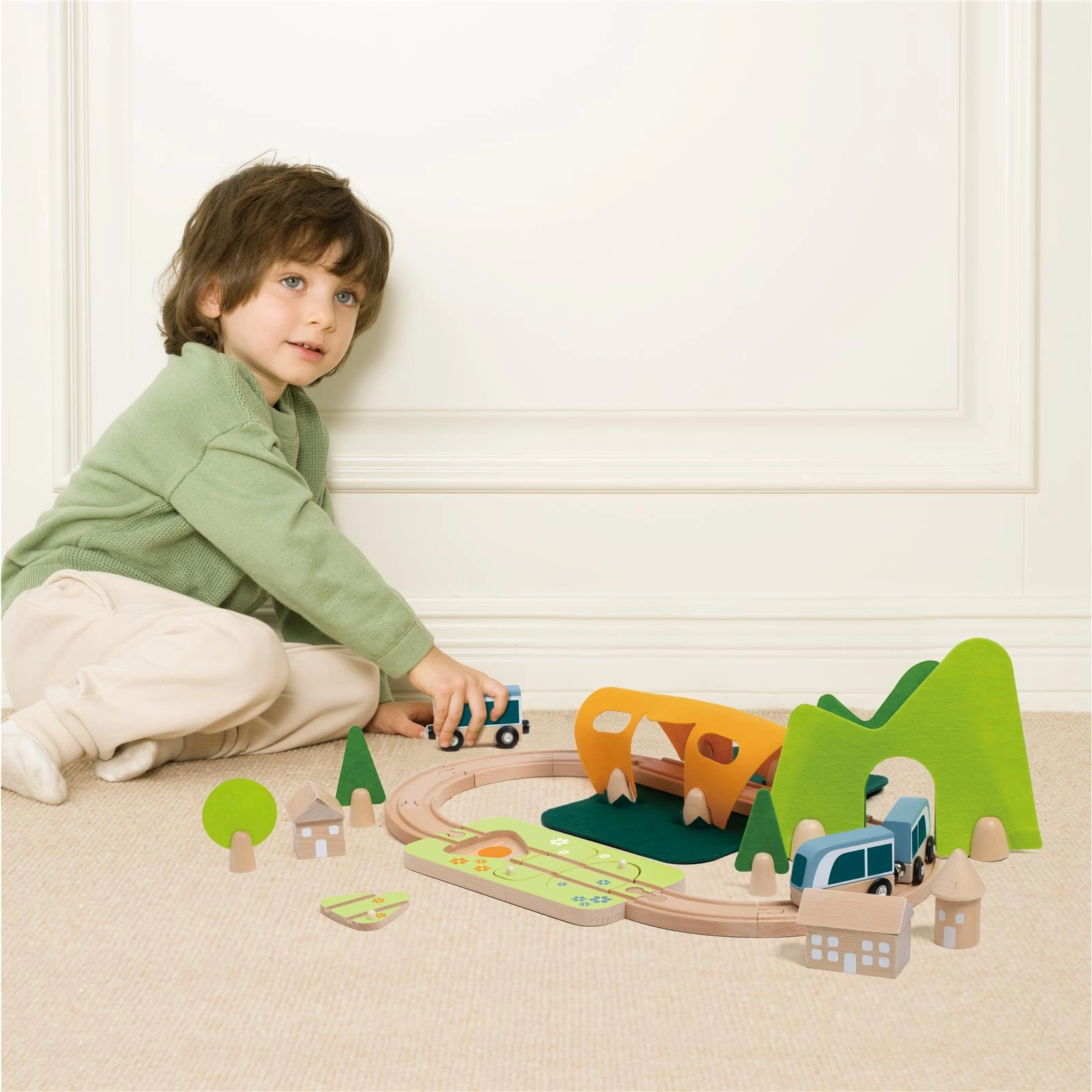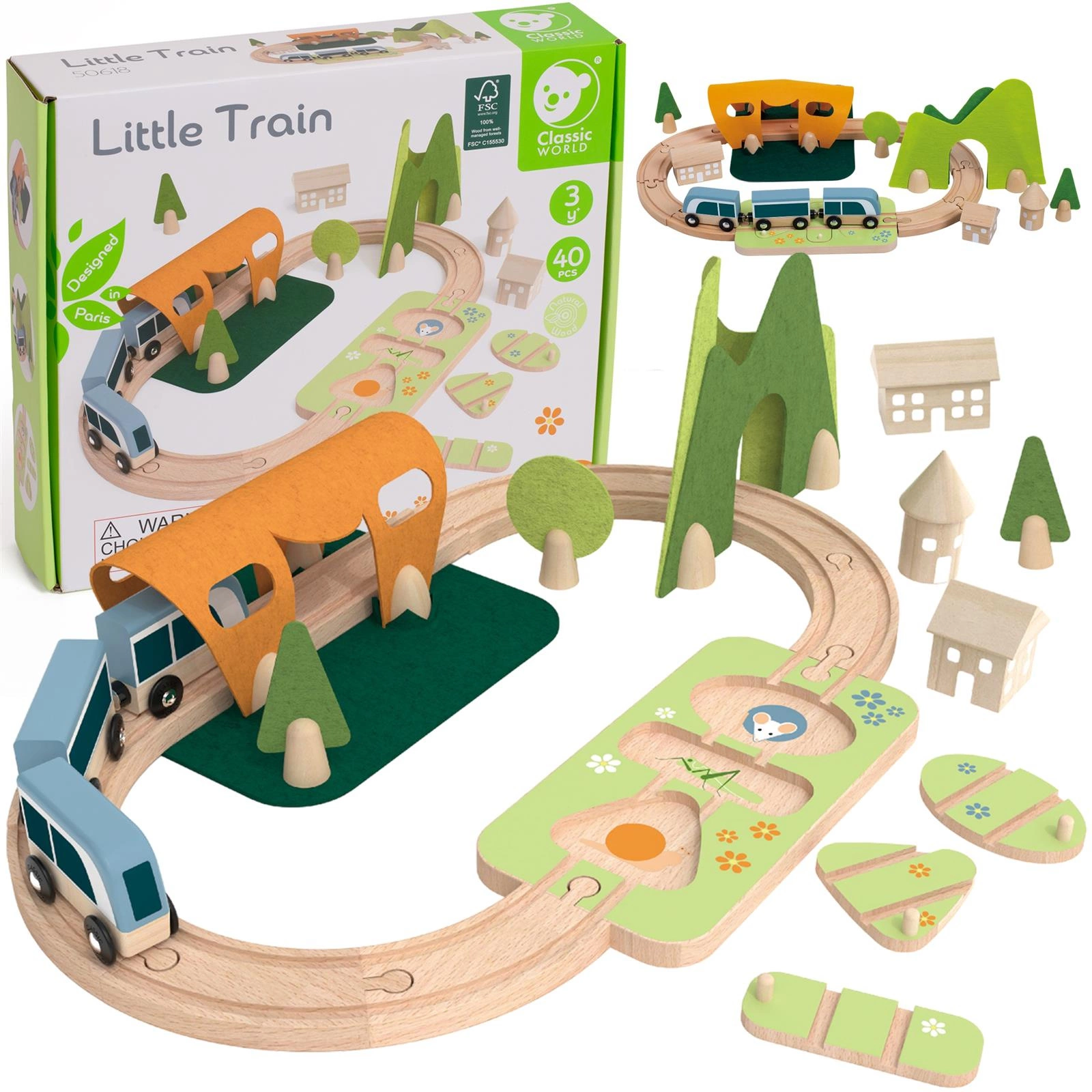 Zestaw kolejka drewniana pociąg od marki CLASSIC WORLD to prawdziwa piękność, a jego atrakcje i filcowe dekoracje pełne są niespodzianek! W zestawie znajdują się tunel, stacja i puzzle z kształtami, które można połączyć, aby odbudować trasę. Kolorowe kwiaty i ukryte zwierzęta pomagają w znalezieniu odpowiednich kształtów. Bloki można układać w stosy, tworząc domy, które można ustawić wokół toru. Pociąg ten stymuluje kreatywność, rozwój języka, małą motorykę i koordynację. Drewno posiada certyfikat FSC, a filc wykonany jest z materiału P.E.T. pochodzącego z recyklingu.