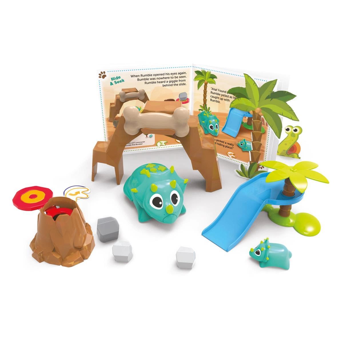 Rumble i Bumble, to wesołe dinozaury, które w przystępny i zabawny sposób wprowadzają dzieci w świat programowania w 100% bez ekranu. Uczą najmłodszych krytycznego myślenia, samodzielnego rozwiązywania problemów oraz stanowią doskonały wstęp do nauk ścisłych, technologi, inżynierii i matematyki. Dzieci, poprzez zabawę ze swoimi zwierzakami tworzą pierwsze programy. Podejmij wyzwanie i sprawdź, czy potrafisz zaprogramować dinozaura, by bawił się w chowanego, toczył głaz ze swojej wyrzutni lub przewrócił rozpadającą się jaskinię? Rumble nie tylko wykonuje proste polecenia, ale może stać się również wyjątkowym, uroczym zwierzątkiem domowym. Wystarczy nacisnąć jego nosek, aby aktywować Tryb Zabawy. Teraz można go nakarmić, pogłaskać lub położyć spać. Można nawet sprawić, że zatańczy i zaśpiewa zabawne piosenki! Oprócz podążania za wyzwaniami zawartymi w dołączonej do zestawu książce, dzieci mogą samodzielnie tworzyć własne programy. W zestawie są dwie książeczki w języku polskim i angielskim oraz polska instrukcja.