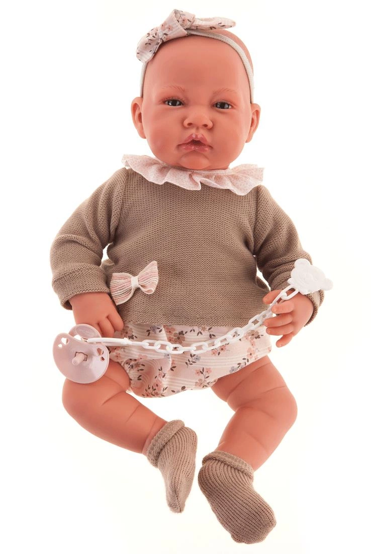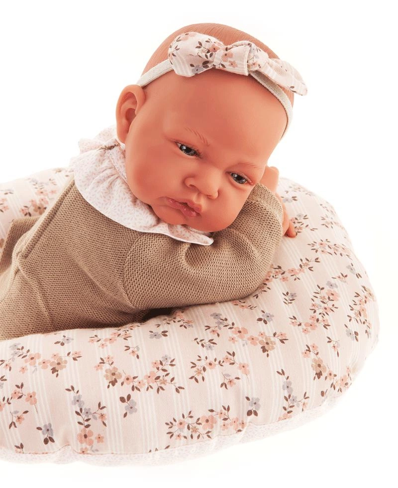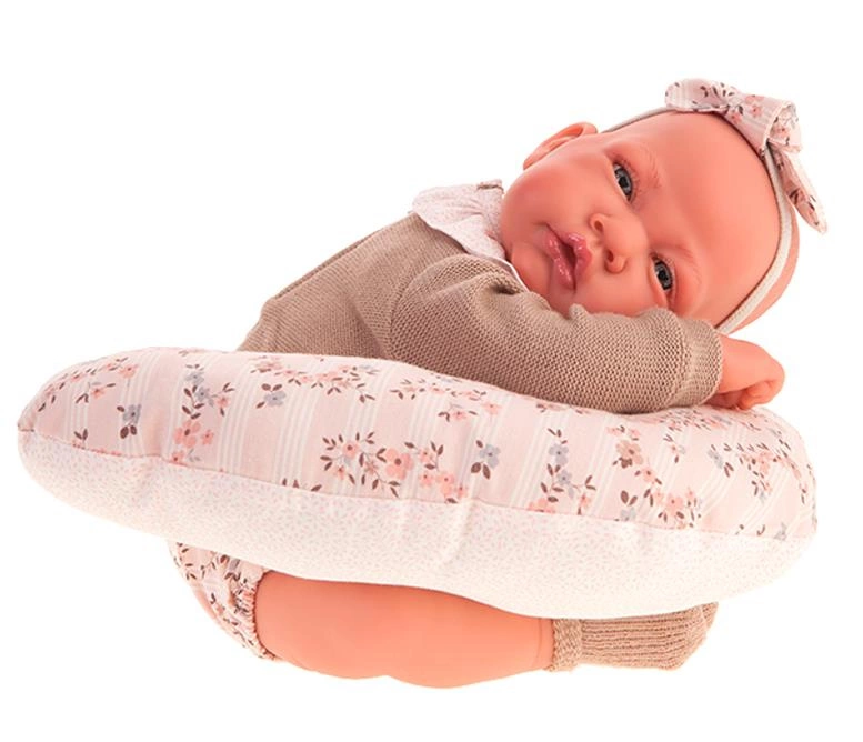 Roześmiana dziewczynka została ubrana w uroczy zestaw. Lactancia ma na sobie beżową bluzeczkę na długi ręka oraz bufiaste spodenki z motywem w kwiaty. Elementem dekoracyjnym bluzki jest biały elegancki kołnierzyk udekorowany drobnymi kwiatuszkami. Dodatkowo uzupełnienie zestawu stanowią: beżowe skarpetki wykonane z dzianiny, cieniutka elegancka opaska z kokardką oraz poduszka w kształcie półksiężyca o kwiecistym wzorze. Mięciutka poduszeczka pozwoli na wygodne ułożenie laleczki do snu, a każda z dziewczynek z wielką przyjemnością będzie zabierała swoją laleczkę na wspólną drzemkę.