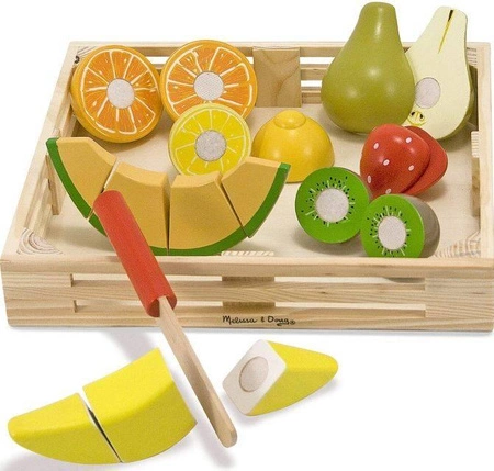 Bogato wyposażony zestaw do krojenia Cutting Fruit Melissa & Doug zawiera wiele apetycznie wyglądających drewnianych owoców. Elementy łączą się na rzepy, dzięki czemu łatwo je oddzielać i ponownie łączyć. Znakomity pomysł na zabawę w domu, ponieważ maluchy uwielbiają wcielać się w rolę kucharza. W drewnianej skrzyneczce znajdziemy: banana, truskawkę, kiwi, gruszkę, pomarańczę i arbuza oraz nożyk. Zestaw Cutting Fruit Melissa and Doug to fantastyczna okazja do ćwiczeń rozwijających sprawność manualną naszych pociech, a także do nabywania umiejętności zasad obowiązujących w trakcie przygotowywania posiłków. To również znakomity pomysł na prezent dla dziewczynki oraz chłopca.