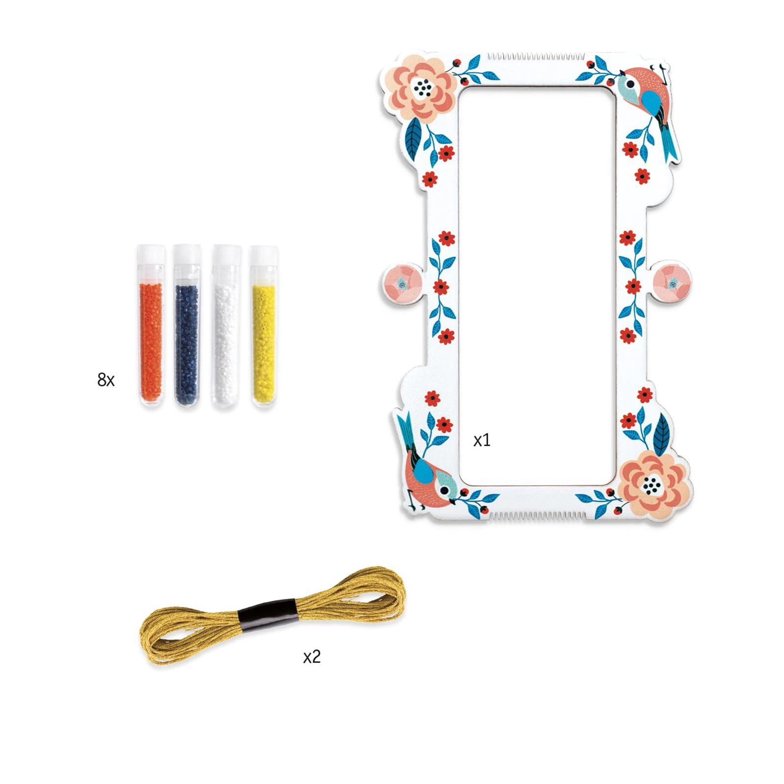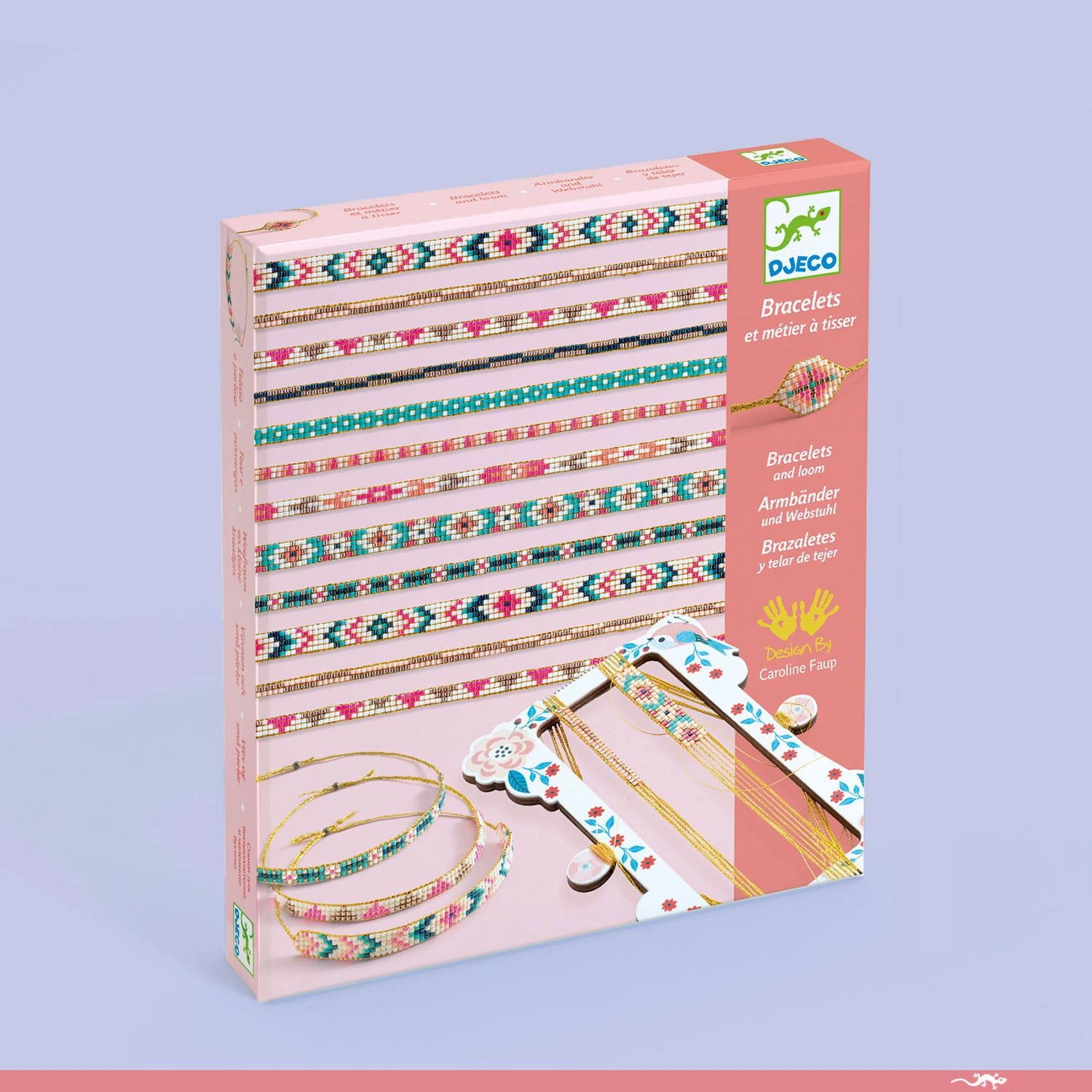 W zestawie znajduje się: instrukcja "krok po kroku" -mini krosno – 2 złote sznureczki