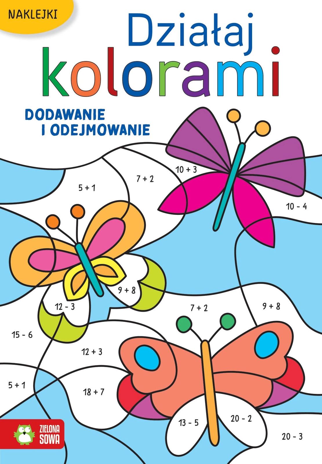 Chwyć kredki i rozwiązuj działania dodawania i odejmowania. Pokoloruj obrazki według otrzymanych wyników i przyklej naklejki. Baw się matematyką jak nigdy dotąd!