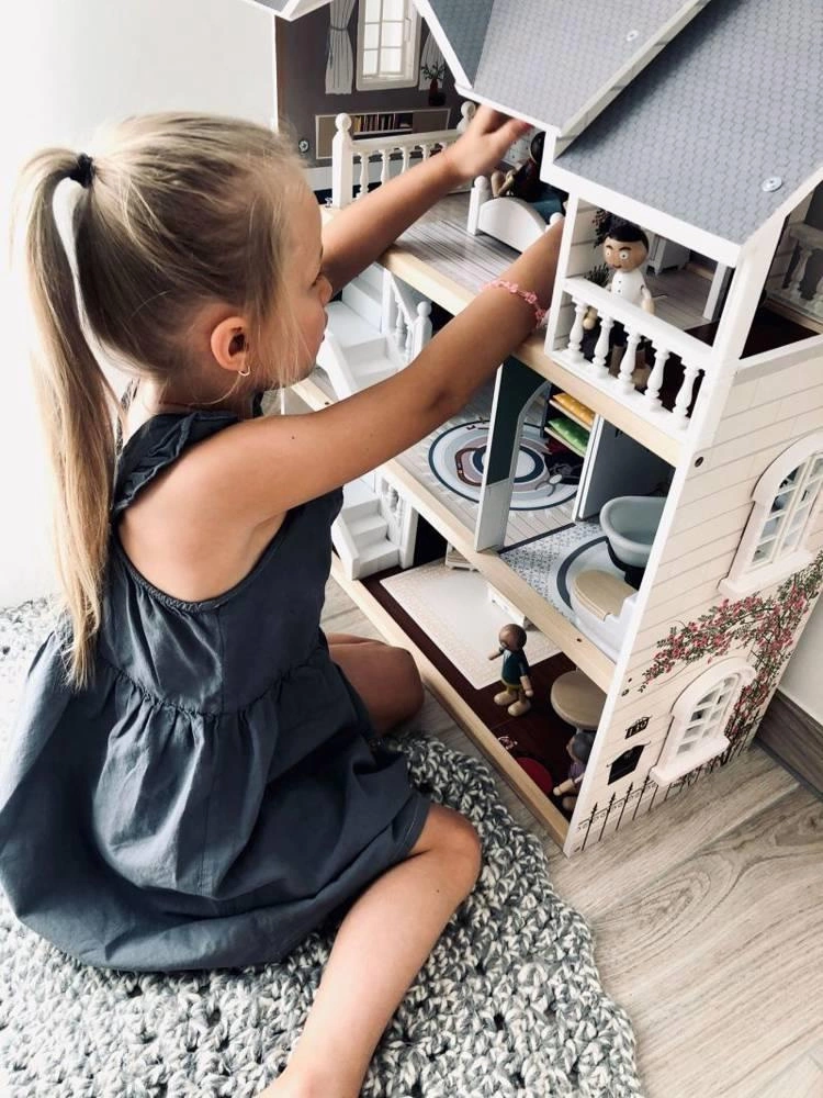 Duży, drewniany, trzypiętrowy domek dla lalek z jasną elewacją to idealny element dekoracyjny pokoju i świetne miejsce do kreatywnej zabawy. Otwarty przód konstrukcji zapewnia łatwy dostęp do wszystkich elementów. W domku znajduje się wiele elementów wyposażenia oraz zaskakujący, prawdziwy dzwonek zapowiadający gości. Domek idealnie pasuje do lalek do 12 cm.