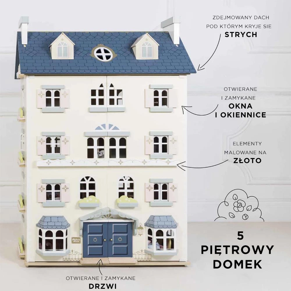 Wznoszący się na pięć kondygnacji, pomalowany w neutralnych tonacjach z licznymi złotymi akcentami, idealny do zabaw neutralnych pod względem płci.