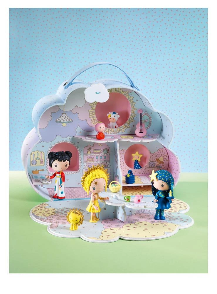 miejsce do zabawy z przyczepą i domem w kształcie chmury.