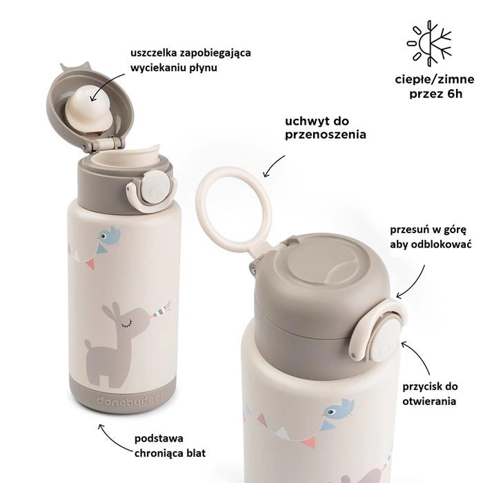Przemyślane detale ułatwiają maluchom samodzielne użytkowanie: zamykana na przycisk pokrywka zaprojektowana dla małych paluszków, bezpieczna silikonowa uszczelka zapobiegająca rozlaniu w plecakach i praktyczny uchwyt do noszenia w podróży. Butelka termiczna utrzymuje napoje dokładnie tak, jak lubi je Twoje maleństwo – ciepłe lub zimne – do sześciu godzin poza domem.