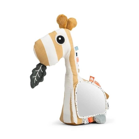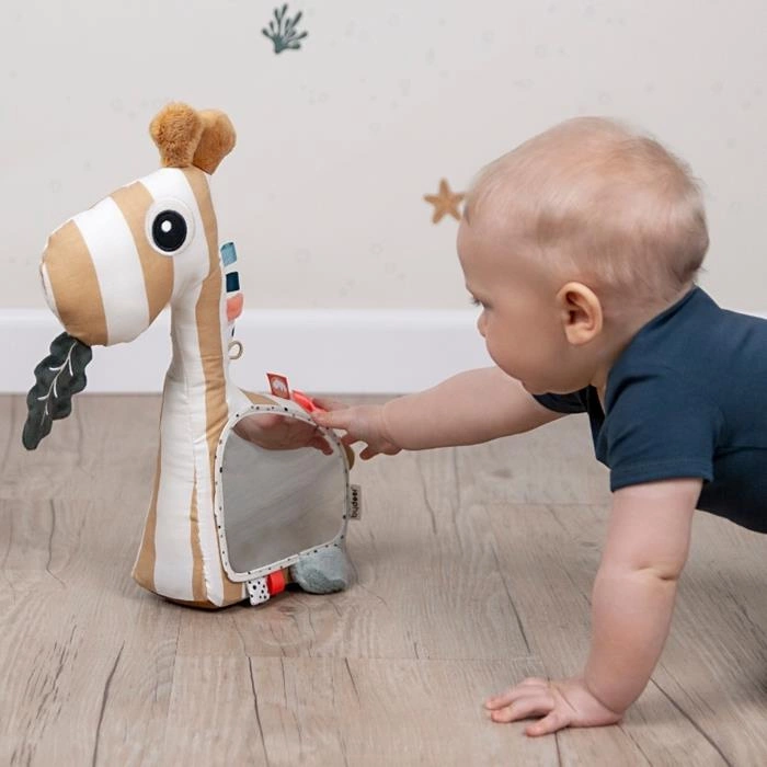 Nie ma nic milszego, niż słodka twarz malucha odbijająca się w lustrze. Miękkie lusterko w kształcie żyrafy Raffi posiada specjalne wypełnienie dzięki, któremu zawsze stoi stabilnie pod odpowiednim kątem, tak aby dziecko miało łatwość uniesienia głowy. Lusterko zostało zaprojektowane tak, aby wspierać integrację sensoryczną maluszka - kolorowe metki, dotykowe tekstury, przyjemny dźwięki dzwoneczka oraz zielony listek, który szeleści dotknięciu - jest tak wiele do obejrzenia i zbadania przez małego odkrywcę.