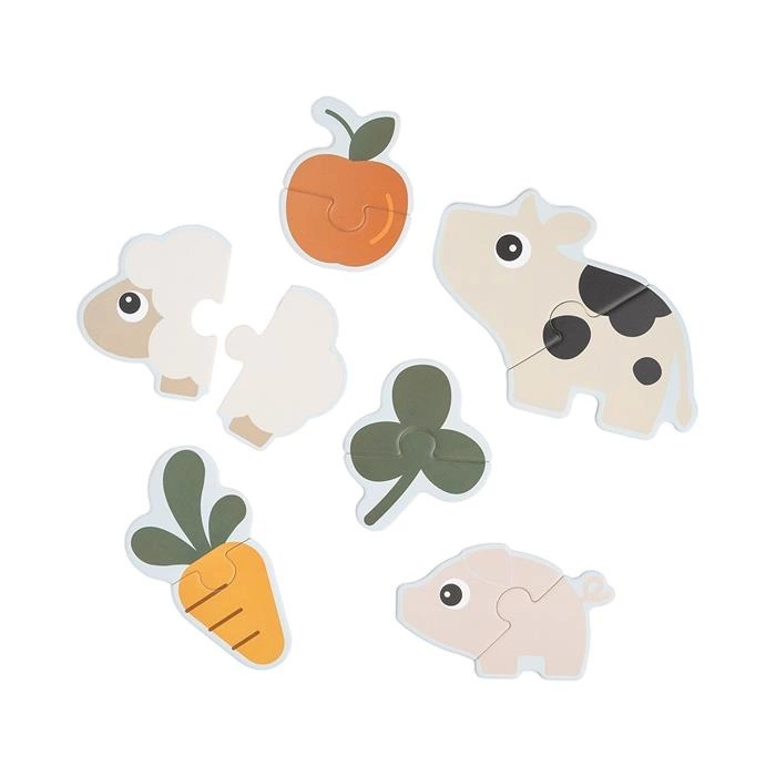 Dzięki 6 puzzlom, z których każde zawiera 2 elementy, maluch  może cieszyć się prostymi, satysfakcjonującymi wyzwaniami. Wykonane z grubej, wytrzymałej tektury, są zbudowane tak, aby służyć na długo. Żywe kolory i kontrasty zapewniają stymulację wizualną, a urocze motywy krówki Dotti, owieczki Sheepy i swinki Pigee sprawiają, że każde rozwiązywanie puzzli jest przyjemne i edukacyjne.