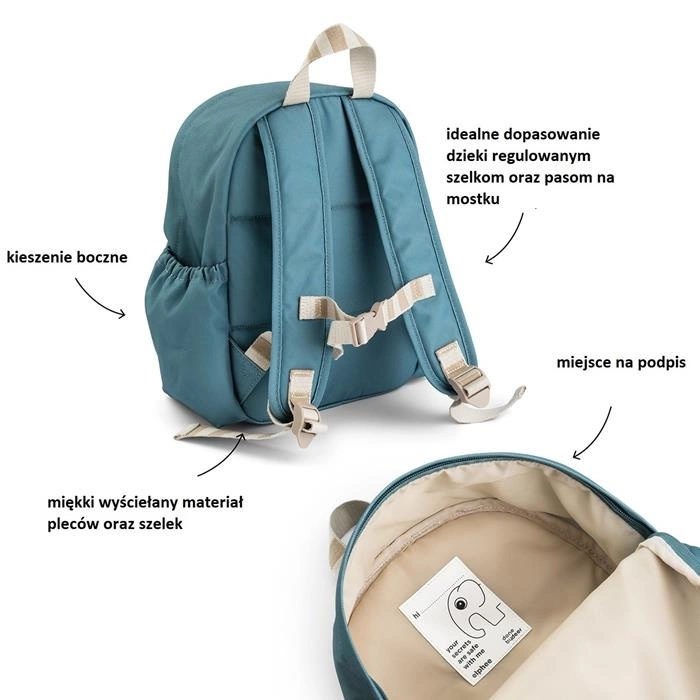 Dzięki miękkim, wyściełanym plecom i regulowanym szelkom dostosowanym do małych ramion, jest wygodny do noszenia przez cały dzień. Plecak posiada dużą główna kieszeń, przednią kieszeń na przekąski do szybkiego chwycenia, a także dwie boczne kieszenie idealne na małe butelkę lub bidon. Plecak wykonany jest z trwałego, wodoodpornego materiału, który wytrzymuje codzienne małe i duże niespodzianki.