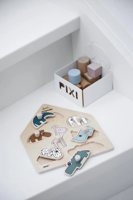 Przyjaciele Done by Deer w jednym drewnianym domku :) Mieszka w nim Żyrafa, Krokodyl, Nosorożec, Mrówkojad, Słonik i Hipopotam. Drewniane puzzle posiadają uchwyty które sprawiają, że małym rączkom łatwo je układać. Podczas zabawy dziecko uczy się dopasowywać kształty, rozpoznawać i nazywać zwierzęta. Układanie poszczególnych elementów o różnym kształcie i rozmiarze rozwija u dziecka zdolności manualne oraz kreatywność. Puzzle sprawią, że dziecko nie będzie chciało się z nimi rozstawać. Drewniana łamigłówka z siedmioma puzzlami wspomoże rozwój umiejętności motorycznych malucha. Pomoże rozwinąć logiczne myślenie i rozwiązywanie problemów.