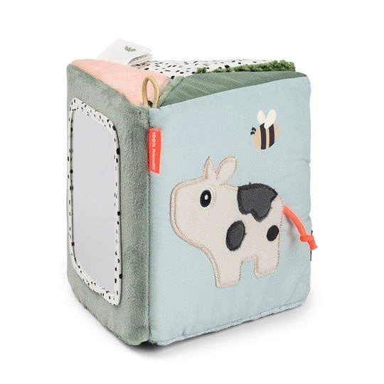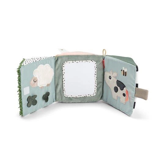 Kontrastowe nadruki i przyjazne postaci zwierzątek przyciągają wzrok maluchów, a szeleszczące faktury i miękki materiał zachęcają małe rączki do dotykania, chwytania i ściskania. Wbudowane lusterko odbija mimikę dziecka – idealne do wczesnego angażowania wzroku i radosnego odkrywania siebie.